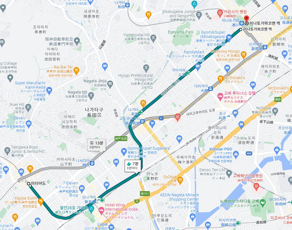 이번에 도착한 역의 이름은 미나토가와코엔(湊川公園)역. 이 역에서는 고베시와 그 주변을 누비는 지역 사철, 고베 전철(神戸電鉄)로 갈아탈 수가 있습니다.