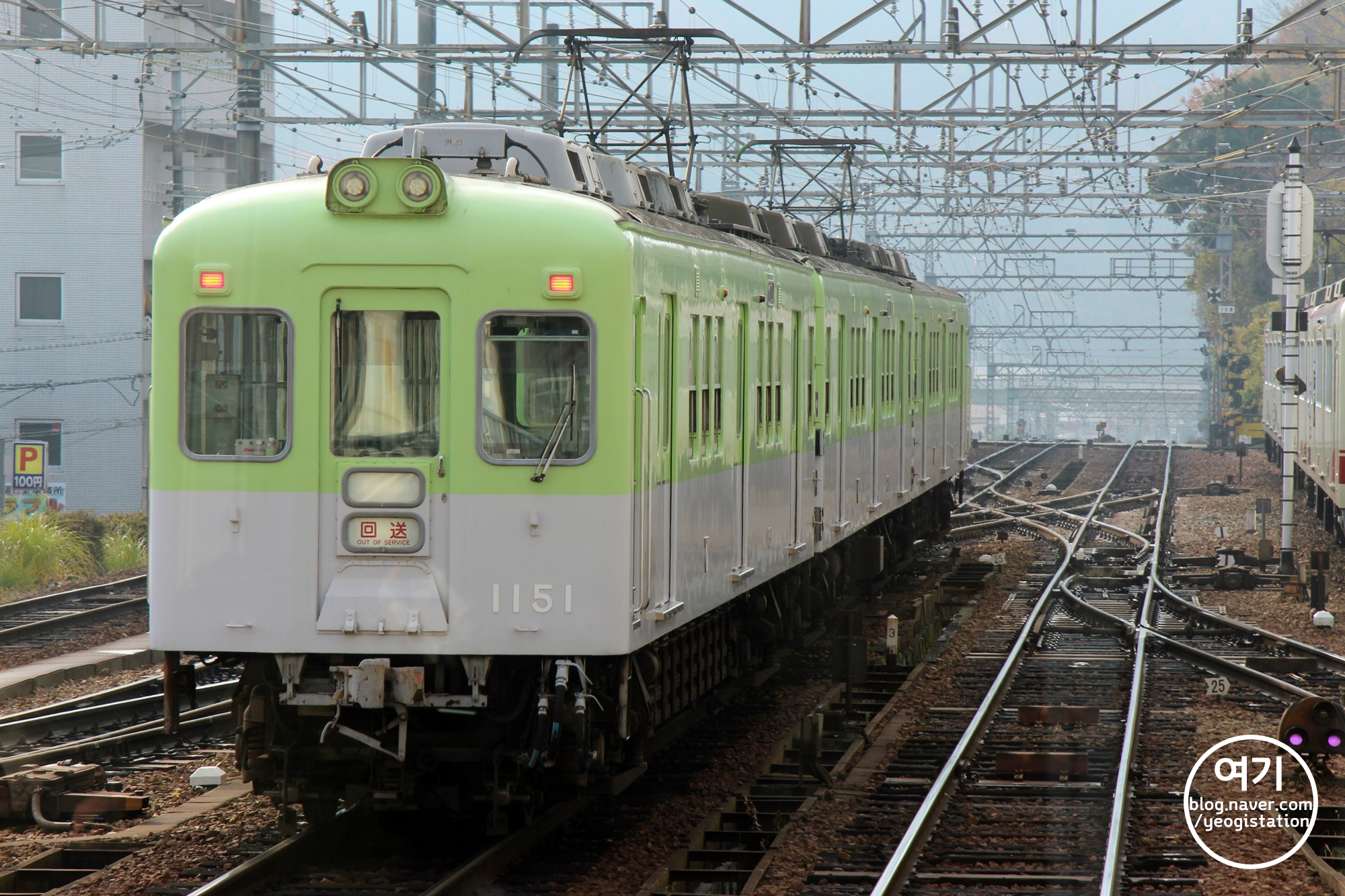 어떤 역에 도착하기 전에, 여분의 선로에 정차해있는 회송 열차 두대를 지나칩니다.(역 남쪽에 차량기지가 있어서 이렇게 열차가 서있는 듯) 윗 사진의 열차는 고베 전철 5000계, 그리고 아랫 사진의 열차는 고베전철 데(デ)1150형+사(サ)1250형으로 소개가 되어 있는데요. 아랫 사진의 열차 3량 중에 양쪽 끝이 데1150형, 가운데가 사1250형이라는 듯. 무려 77년생입니다.