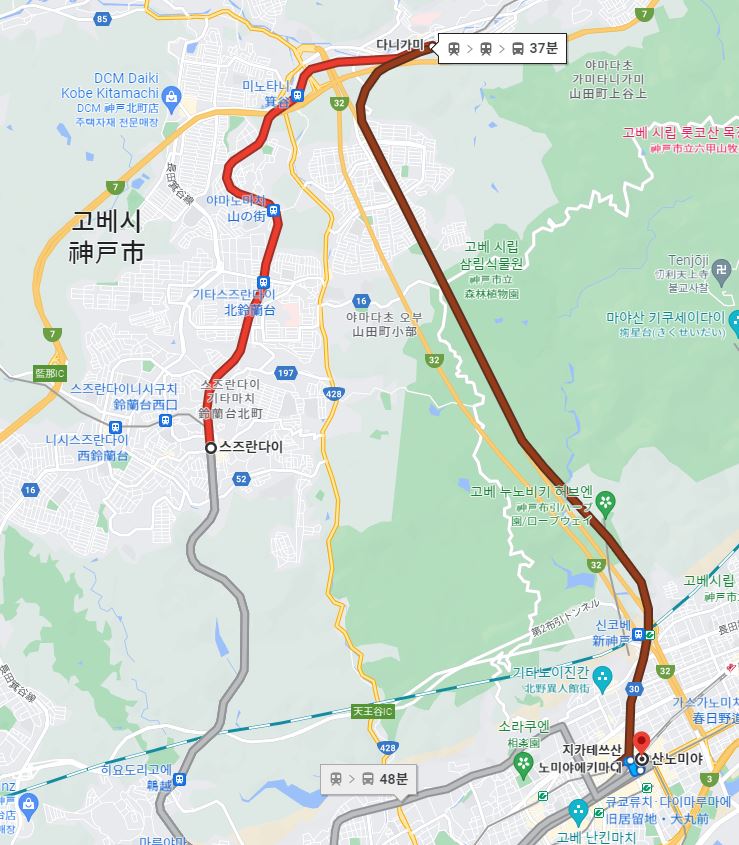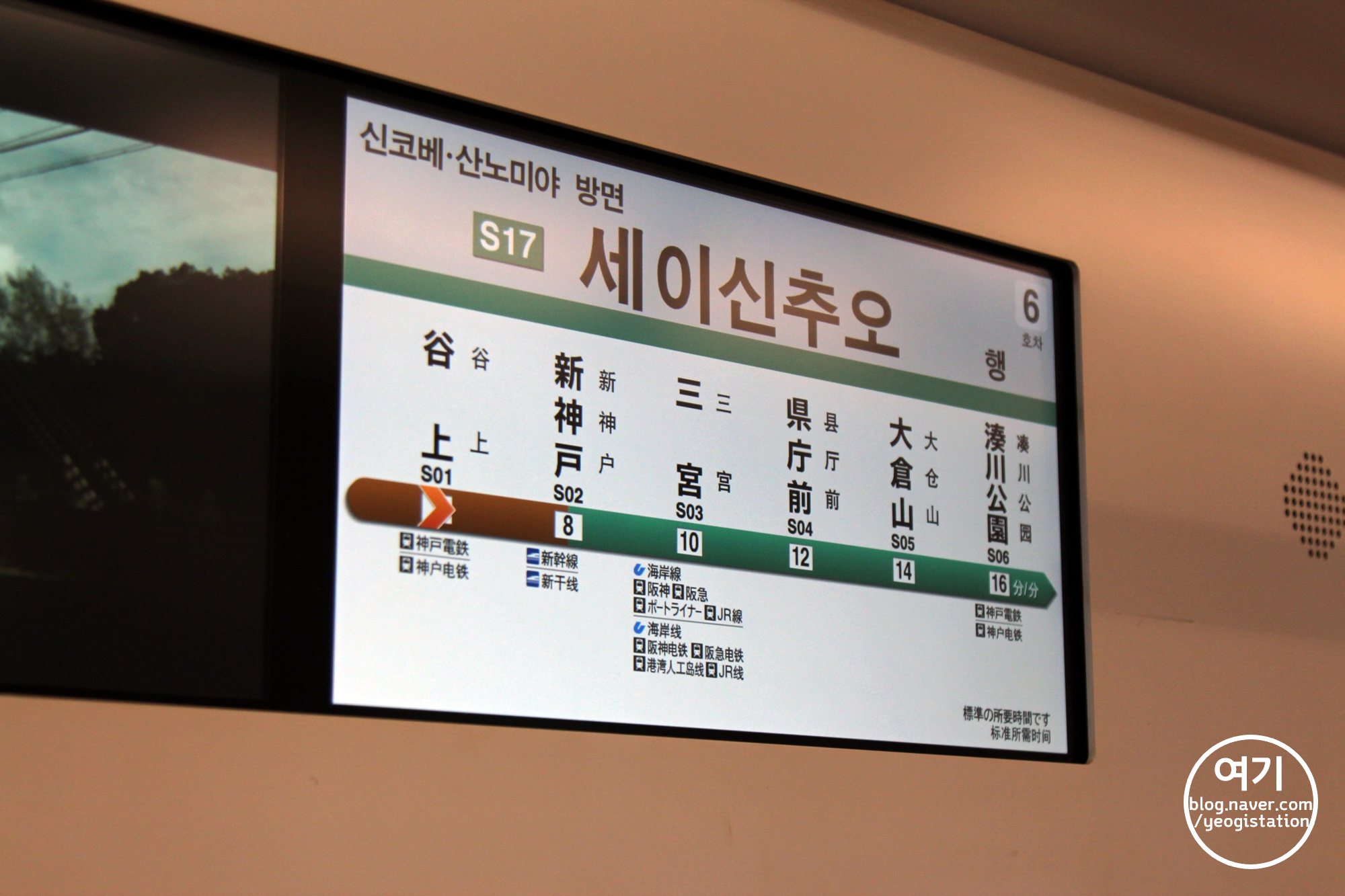 이제 타니가미역에서 출발한 열차에 올라 고베 시내로 귀환합니다. 1개 역 가는데 7.5km, 8분이 걸리는 호쿠신선을 완주한 뒤에 세이신·야마테선으로 진입하여 그 다음역인 산노미야역으로 향합니다.