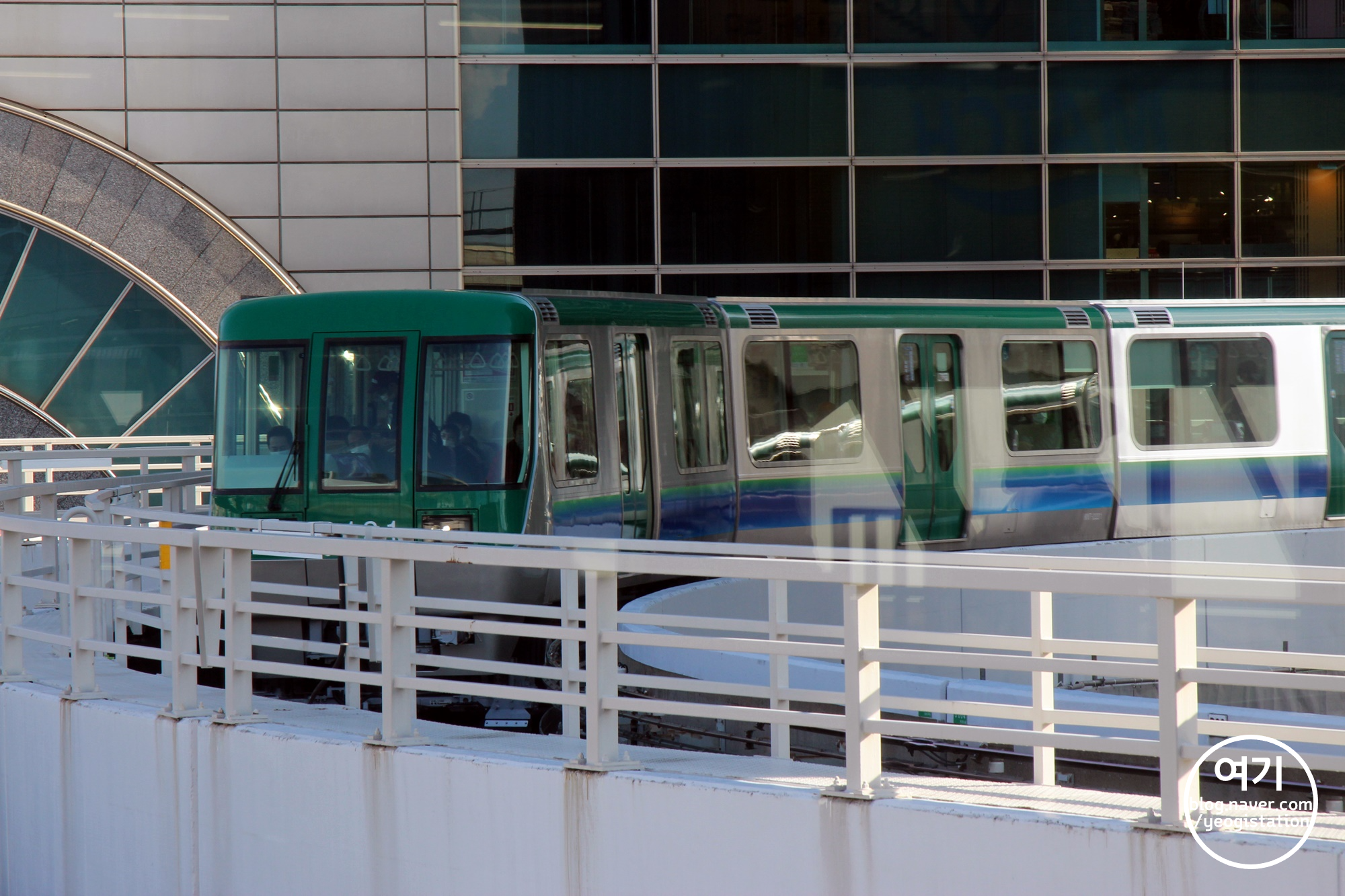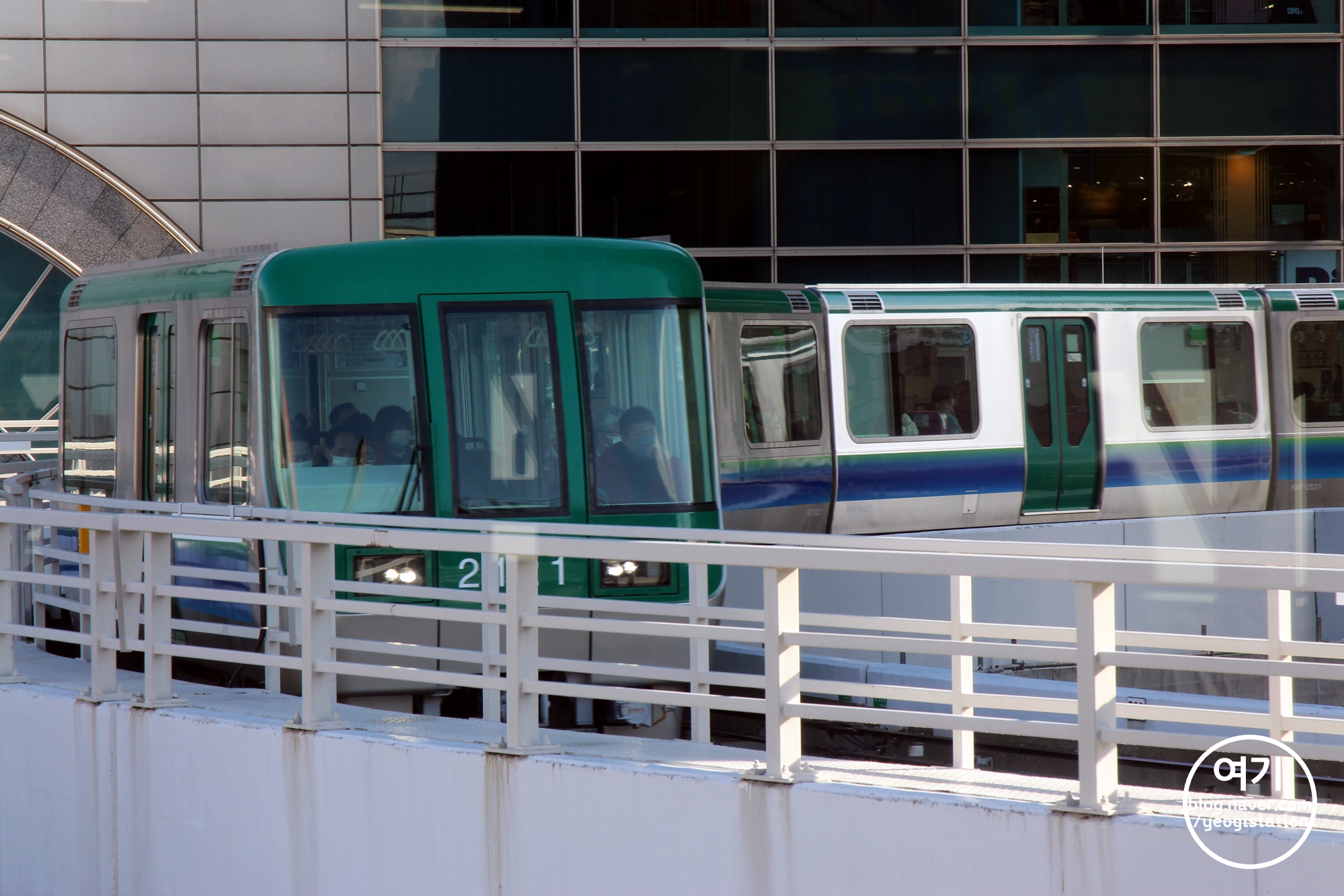 최초의 역을 출발하자마자 크게 우회전해서 나가는 열차... 반대로 역에 도착하는 열차는 크게 좌회전을 해서 승강장으로 들어오게 되는데요. 이런 모습도 또 도쿄의 유리카모메를 연상시킵니다.