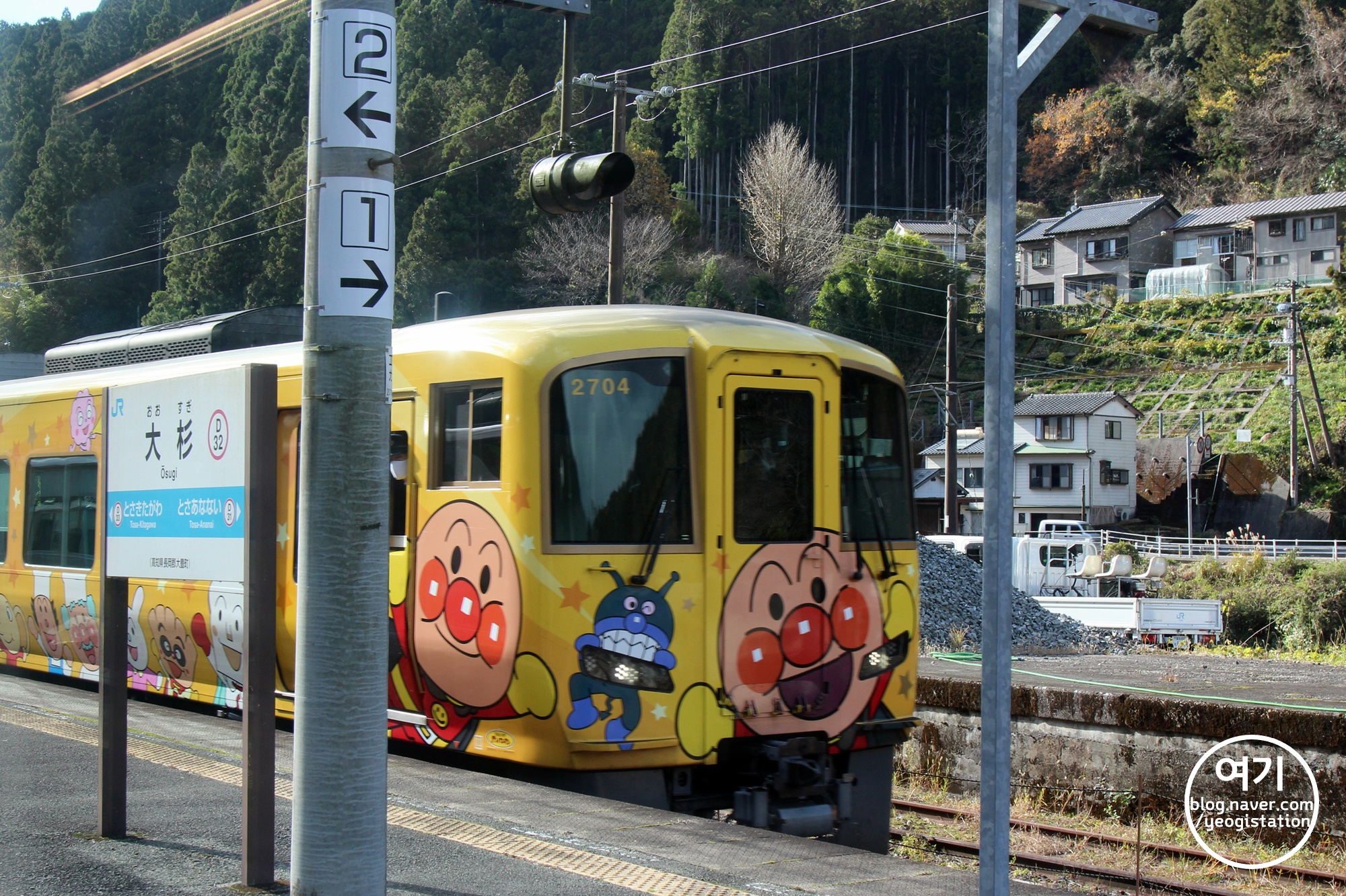 오스기(大杉)역에서는 특급열차간의 교행이 이루어졌습니다. 오카야마(岡山)역으로 향하는 특급열차 난푸(南風)였는데요. 온통 호빵맨 관련 래핑이 덕지덕지 되어있는 인상깊은 외형의 열차입니다. 나중에도 계속 나오겠지만 날아라 호빵맨의 작가 야나세 타카시가 시코쿠 출신이었기 때문에, JR시코쿠로 이곳저곳 여행하다보면 호빵맨을 자주 구경해볼수도 있지요ㅎㅎ