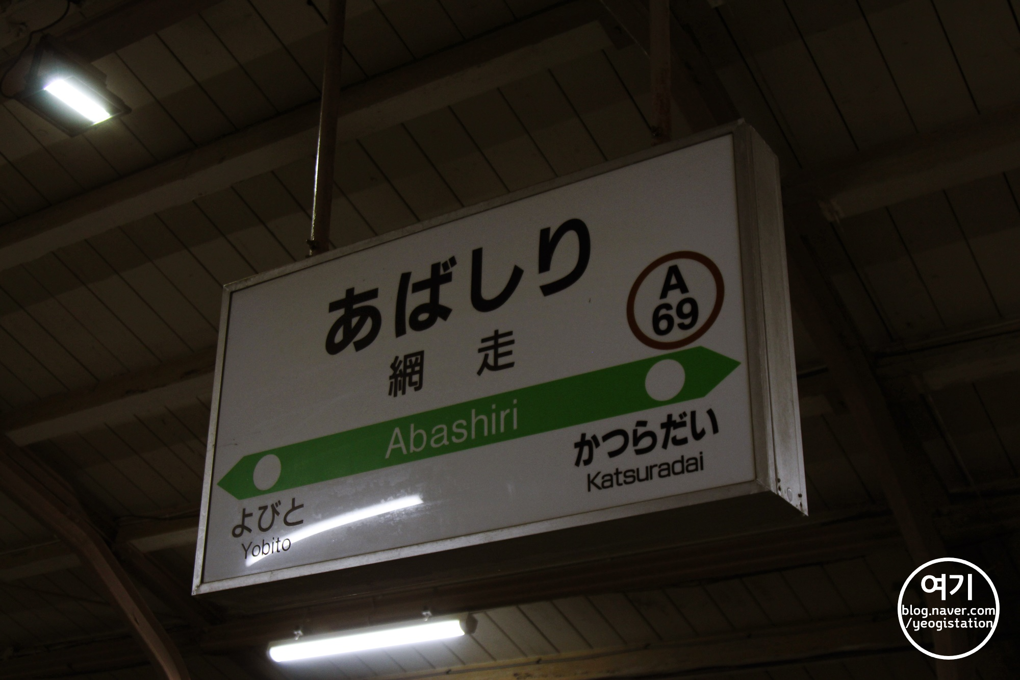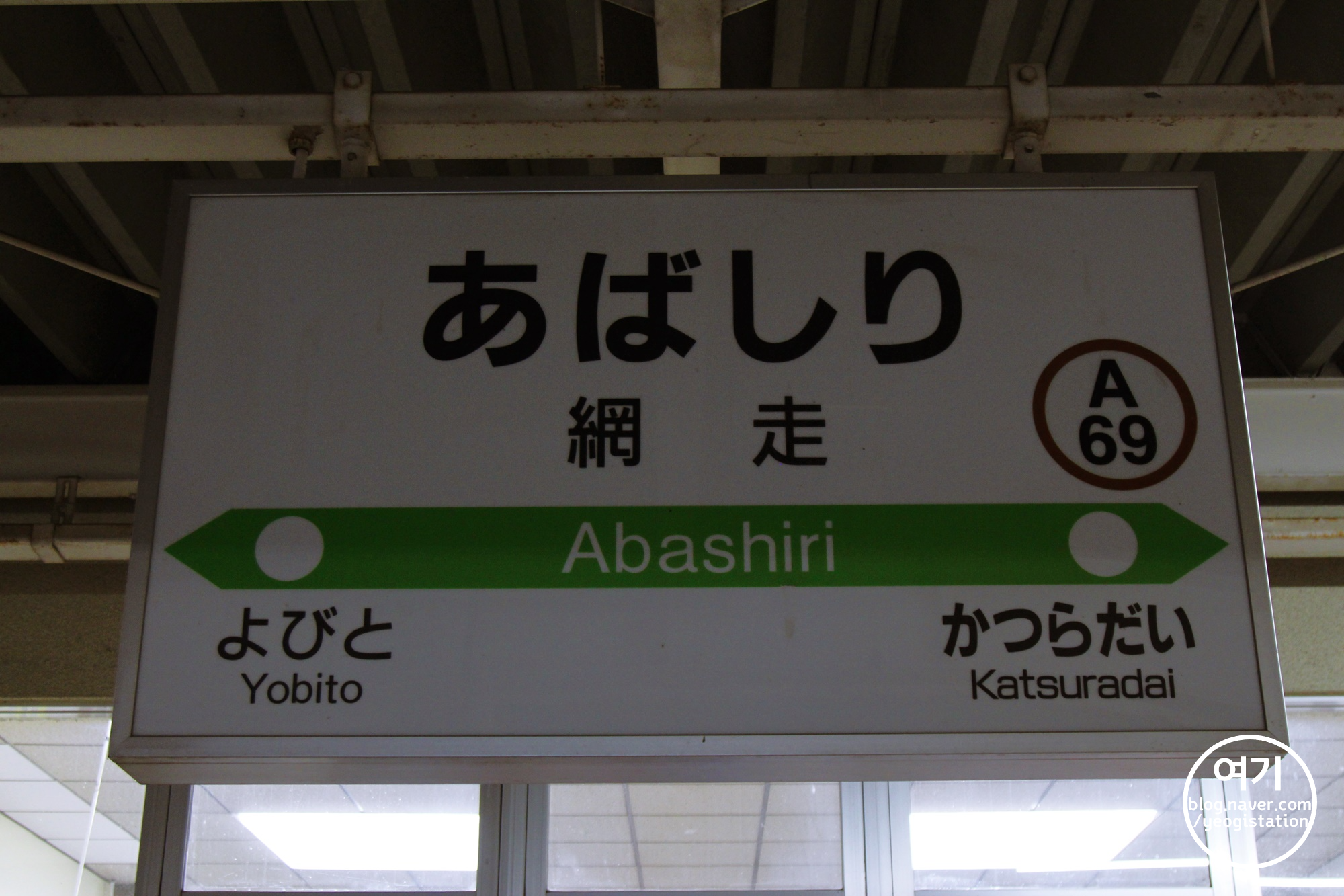 삿포로역의 1번에서 아사히카와(旭川)역의 28번을 거쳐 세키호쿠 본선을 따라 이어지는 역번호, A69번을 달고있는 아바시리역의 역명판입니다. 양쪽에 있는 요비토(呼人)역과 카츠라다이(桂台)역은 서로 다른 노선이기는 하지만, 하루에 2번 정도 직결되는 열차가 있기도 하지요.