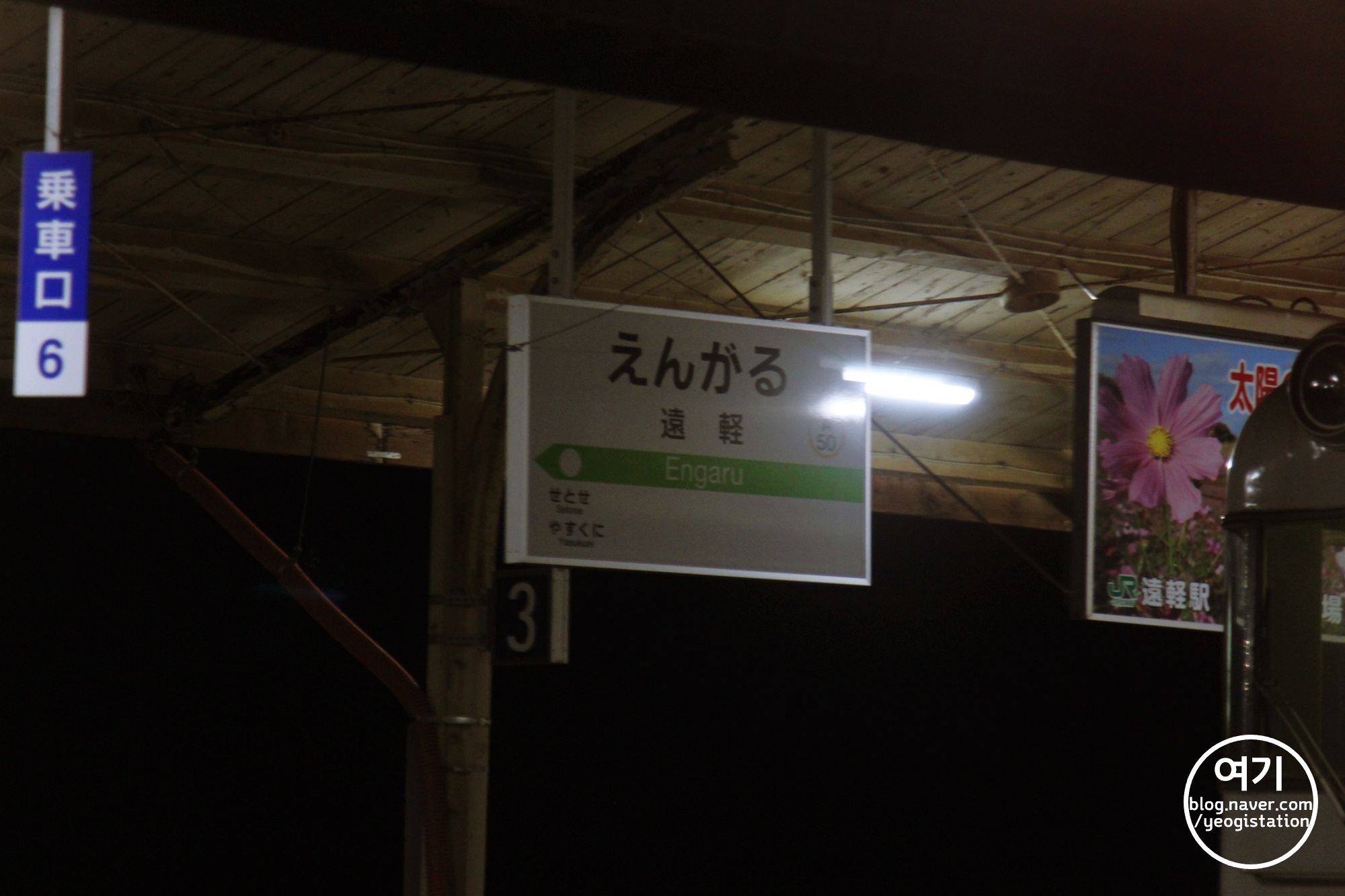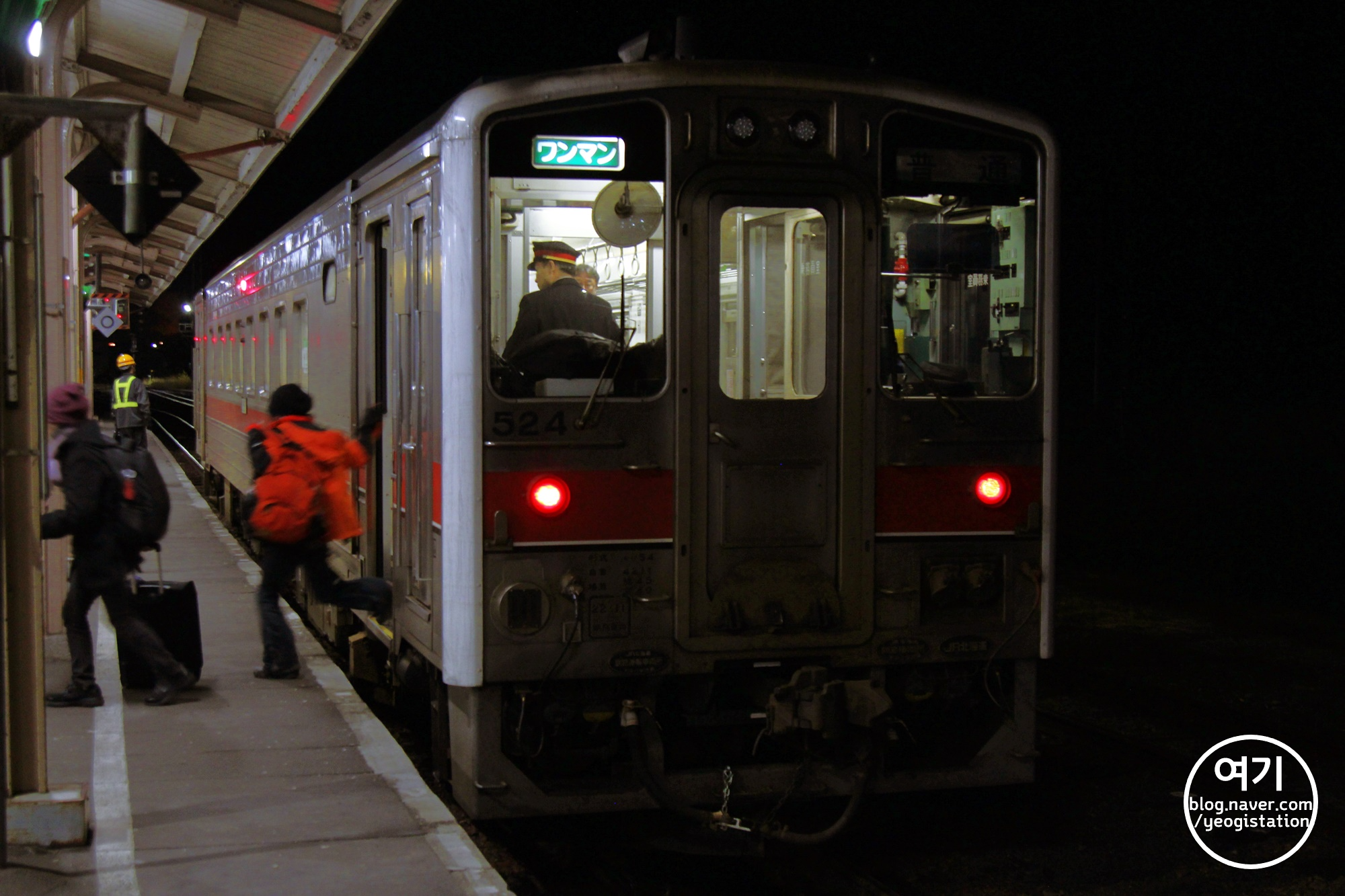 루베시베(留辺蘂), 이쿠타하라(生田原)역을 지나 엔가루(遠軽)역에 정차한 열차. 엔가루역은 현재 ㅅ자 철길의 꼭대기 끝부분에 승강장이 있고, 그 위쪽으로 선로가 끊겨있기 때문에 열차가 진행하기 위해서는 들어왔던 방향 그대로 나가야만 합니다. 그래서 엔가루역에 도착하기 직전에 안내방송이 나와서, 자다가 깬 제가 앉아있는 의자를 180도 돌려야만 했네요... 이걸 승객을 시키다니ㅋㅋㅋ