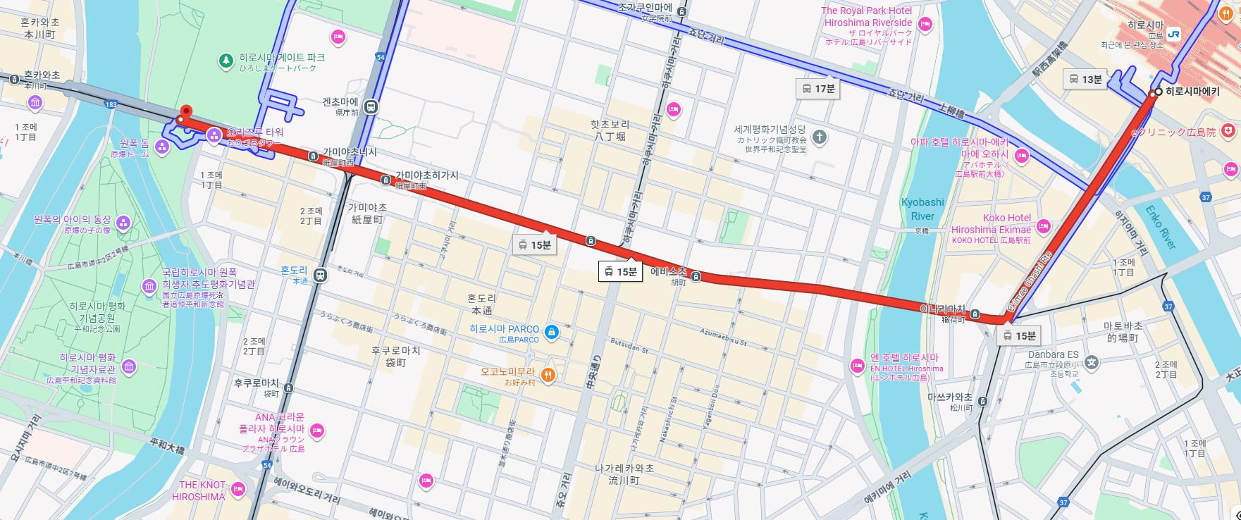 평화기념공원과도 이어지는 T자 모양의 아이오이교(相生橋). 노면전차의 철길도 이 다리위에 놓여있어서 계속해서 전차들이 왔다갔다하는 모습.