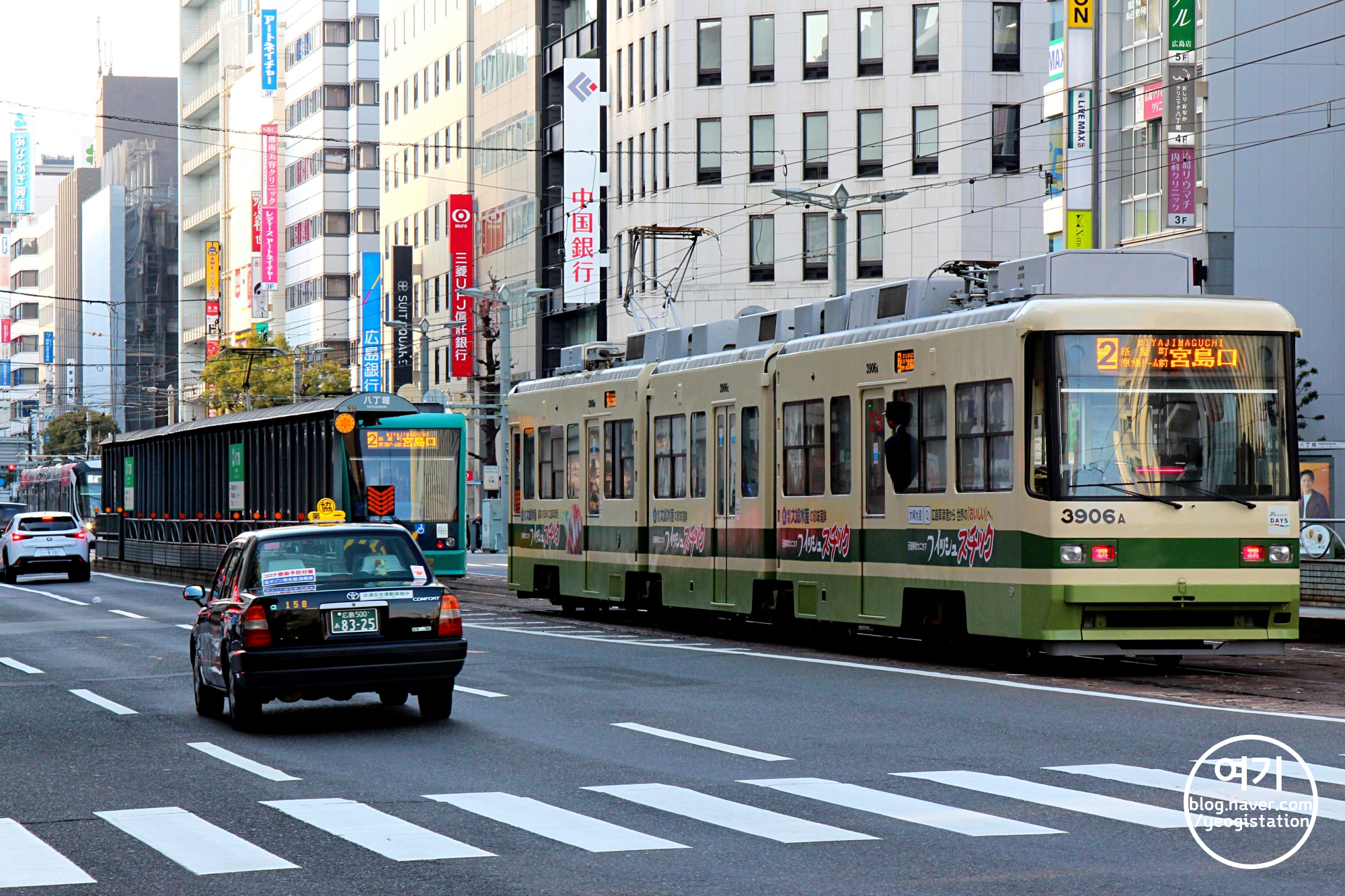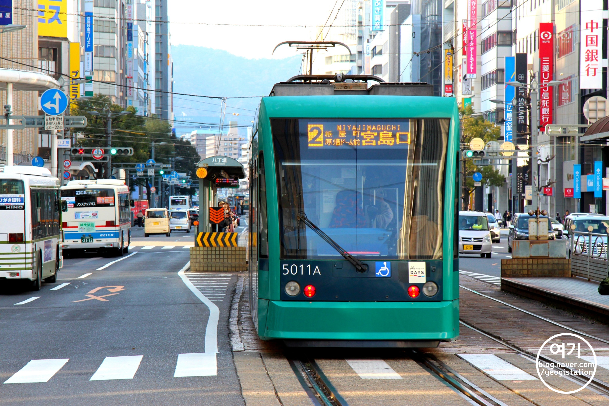위키피디아에서 찾아보기로는 현재 운행중에 있는 차량 형식이 무려 23종! 예를 들면 위 사진의 차량은 3900형이라는 형식으로 분류되어 있는데요. '2번 운행계통'의 노선은 노면전차 구간을 벗어나 일반 철도노선인 미야지마선(宮島線)으로 직결운행을 하고 있기도 하여서 3량짜리 편성이 제법 존재하는 편입니다.