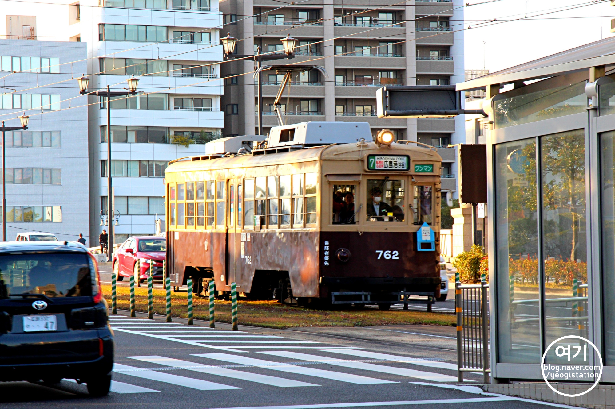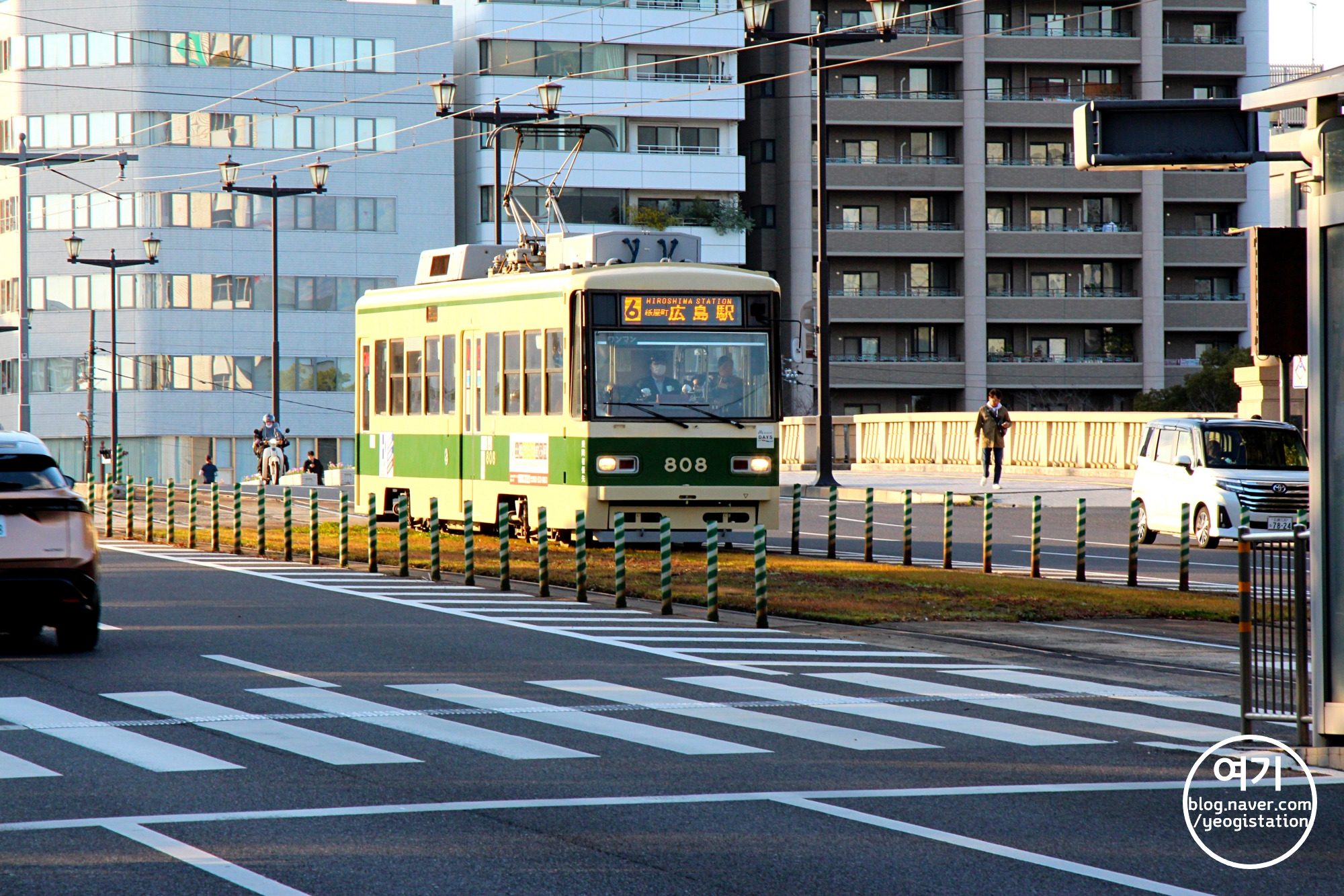 시내 번화가쪽의 에비스쵸(胡町) 정류장에 하차하여 다음 핫쵸보리(八丁堀) 정류장방면을 바라본 풍경. 노면전차의 특성상 역간거리가 짧고 상행·하행 승강장이 교차로를 사이에 두고 따로따로 만들어져 있는 경우가 많은데, 이곳의 경우엔 에비스쵸 정류장의 서쪽방면 승강장과 핫쵸보리 정류장의 동쪽방면 승강장이 거의 붙어있다시피 하네요ㅎㅎ