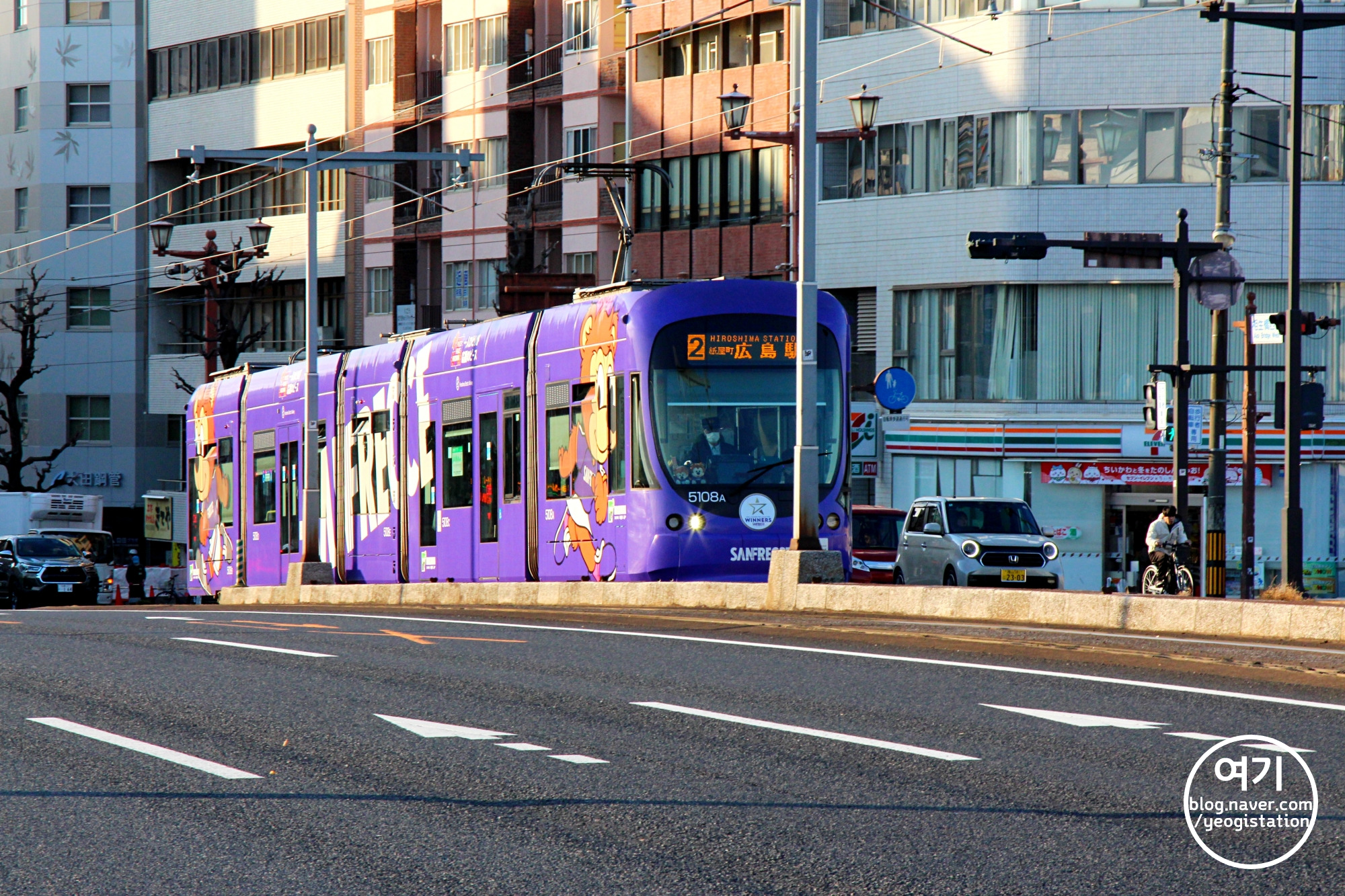 계속해서 인근에서 노면전차 구경중. 비교적 최근인 2007년에 제작된 5100형 차량인데, 히로시마를 연고로 하는 축구팀인 산프레체 히로시마 관련 도색이 되어있습니다.