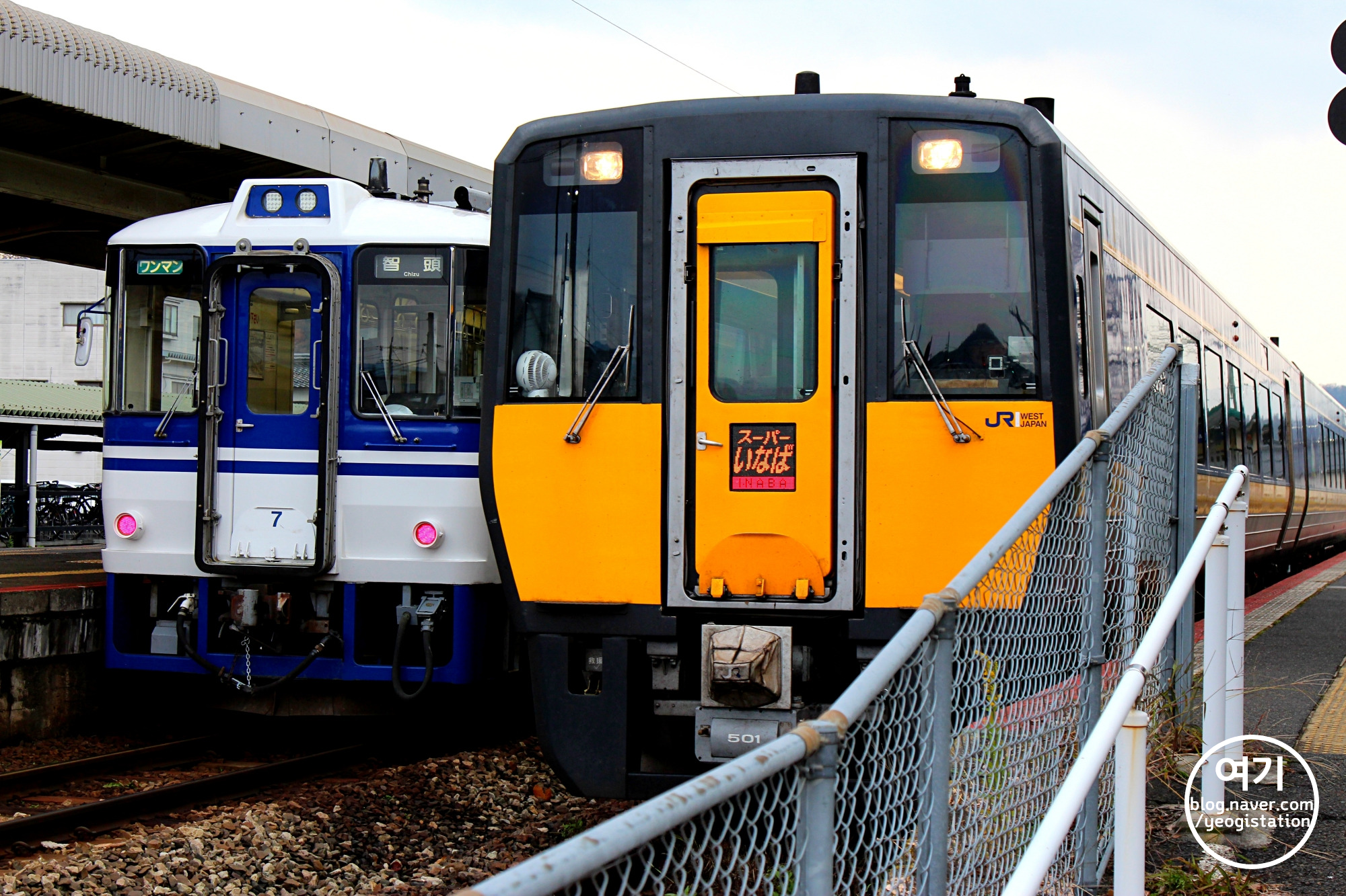 2량짜리 슈퍼 이나바. 슈퍼 이나바는 교토, 오사카-돗토리 사이를 잇는 특급열차, 슈퍼 하쿠토(スーパーはくと)와 함께 사철회사인 치즈 급행(智頭急行)이 소유, 운영하는 치즈 급행 치즈선(智頭線)을 경유하는 특급열차입니다.