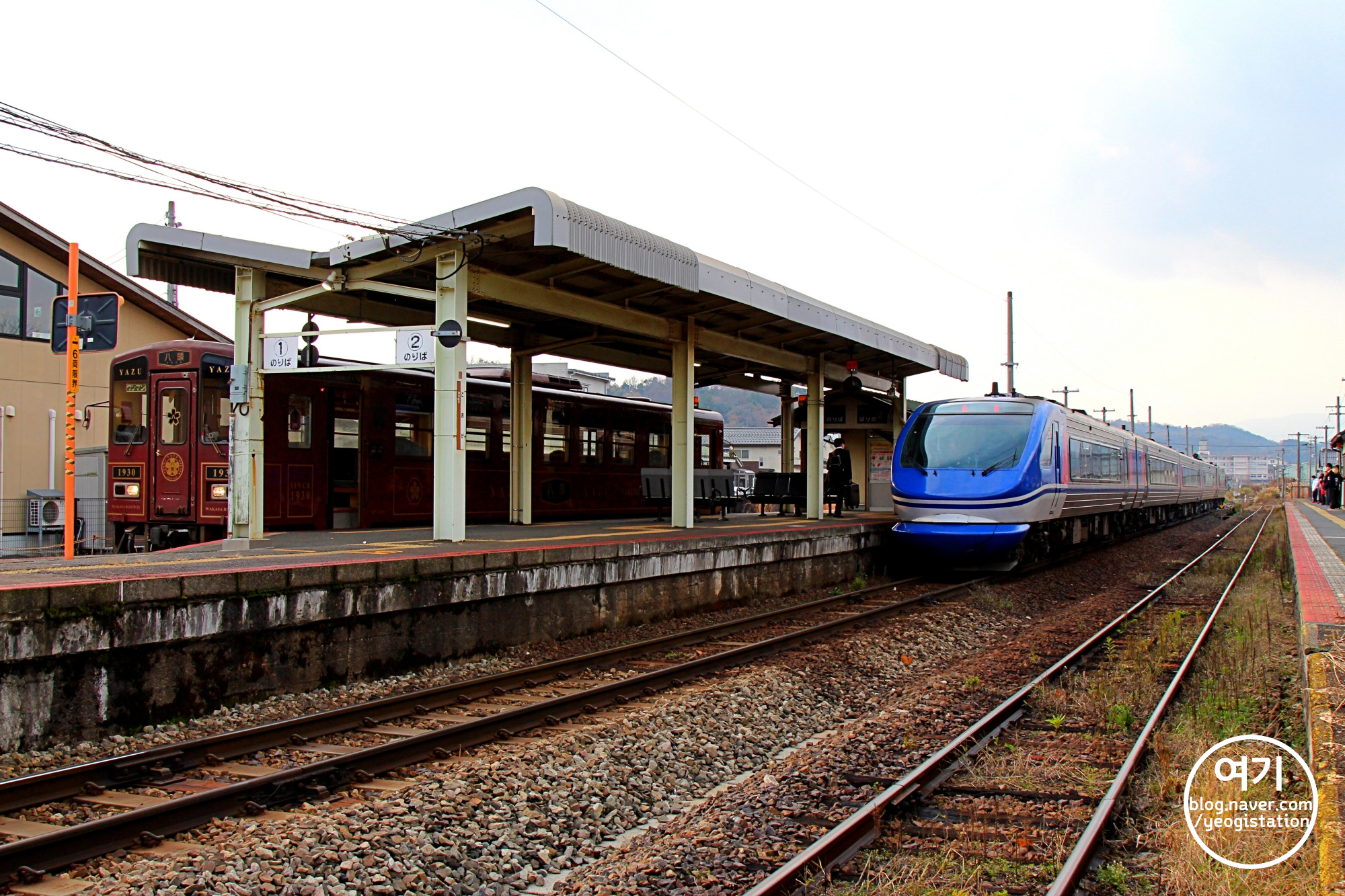 코게역 1, 2번 타는곳에 나란히 정차중인 와카사 철도의 챠량, 그리고 치즈급행의 차량.
