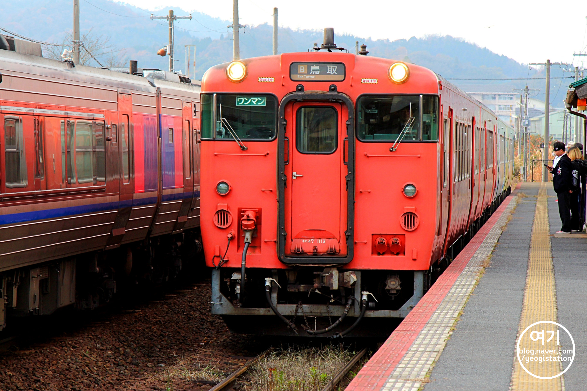 아직 슈퍼 하쿠토가 출발하기도 전에... 실은 보통열차가 먼저 들어와서 선로 자리를 비켜주기 전까지 출발을 '못'한 것이겠지만. 어쨌든 돗토리역으로 향하는 키하47형의 보통열차가 코게역에 도착했습니다. 돗토리역에 가서 먼저 뭐라도 먹고...