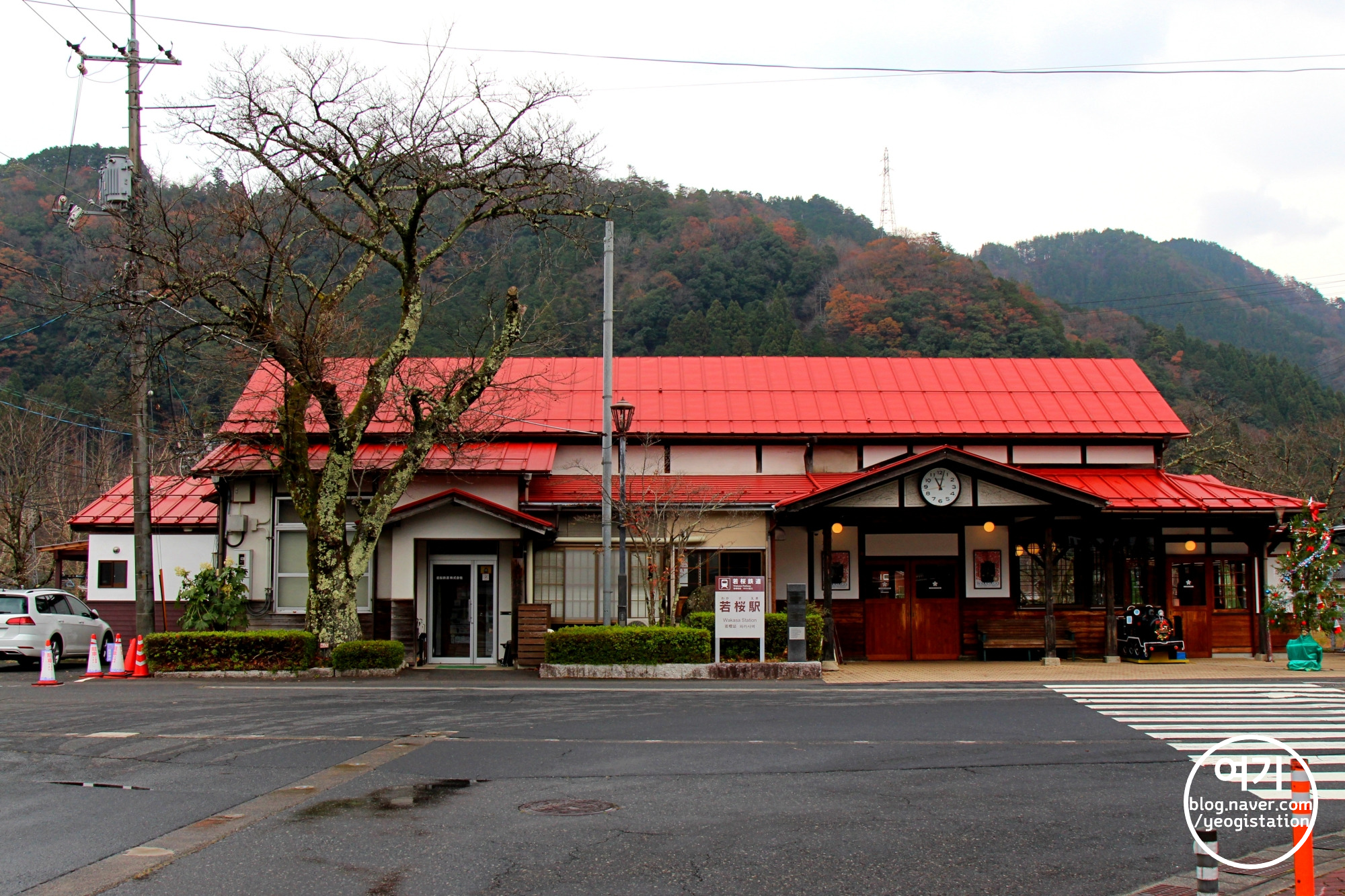 돗토리현에서 가장 동쪽에 위치해 있는 와카사정(若桜町)의 중심이자 유일한 역인 와카사선의 종점, 와카사역에 도착했습니다. 승객들이 하차하는 승강장과 바로 접해있는 목조 역사의 모습이 가장 먼저 보이는데요.