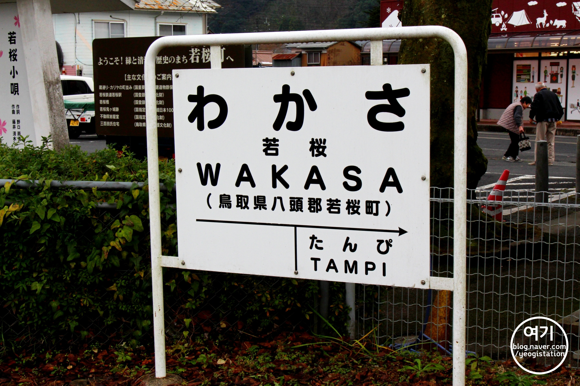 와카사역의 역명판. '와카사'라는 이름은 후쿠이현(福井県)의 서부 지방의 옛 지명인 와카사(若狭)와도 발음이 같지만 이곳 돗토리의 와카사는 와카사(若桜)라고 표기되고 있습니다. 뒤의 '사'는 '사쿠라(桜)'의 '사'인듯.