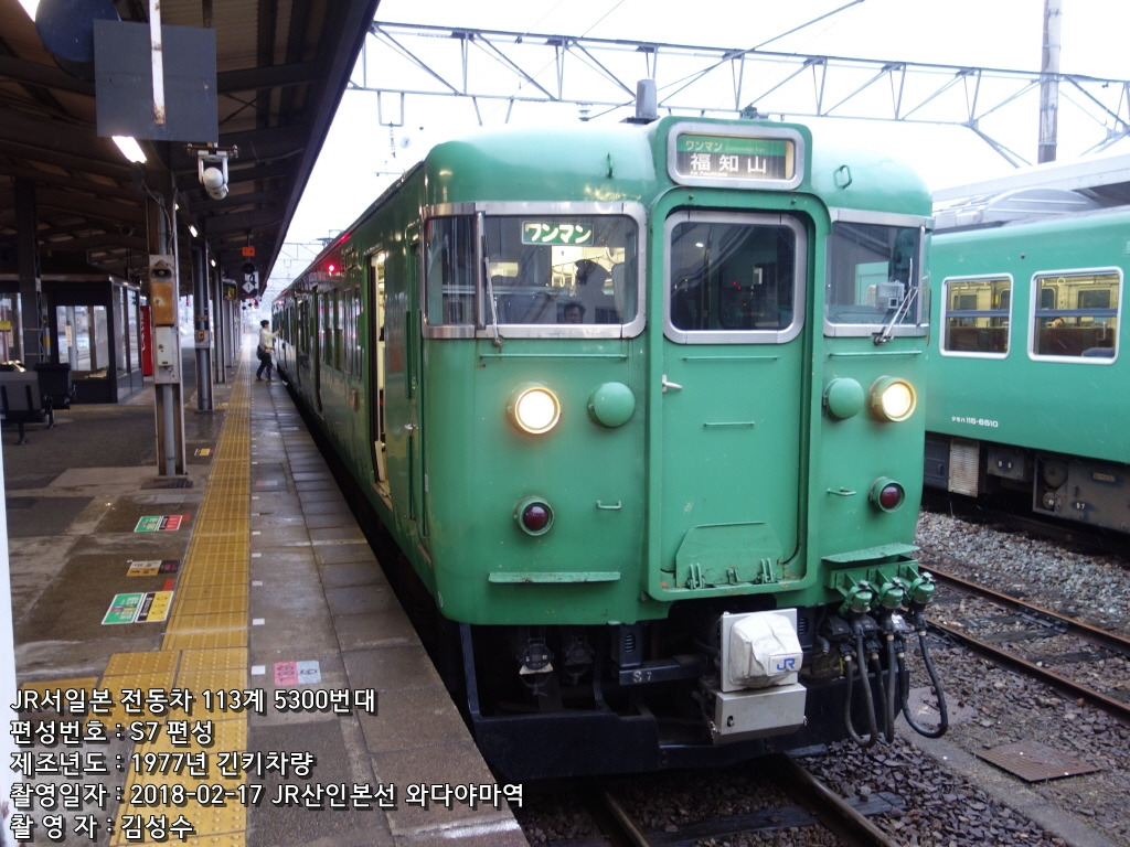 후쿠치야마전차구에 배치된 113계는 2량편성이며, 5300번대로 구분된다. 즉 300번대 + 고속대응으로 +5000이 되어 5300번대가 된 것인데, 1인승무 운전 및 한랭지운전에 대응된다. 1996년에 산인본선 소노베~후쿠치야마 구간의 전철화 공사 완공으로, 1995년부터 1996년 사이에 5300번대 2량편성 6편성이 개조되었다. 원래 9편성을 만들 계획이었으나, 한신-아와지 대지진 때문에 6편성만 생산하였으며, 부족분은 5800번대가 급하게 개조되어 충당되었다.(5800번대는 현재 폐차되었다.) 전부 중간 모터카가 개조되었기 때문에, 운전대가 신설되었는데, 이것은 폐차된 쿠하111형에서 이식해 온 것이다.