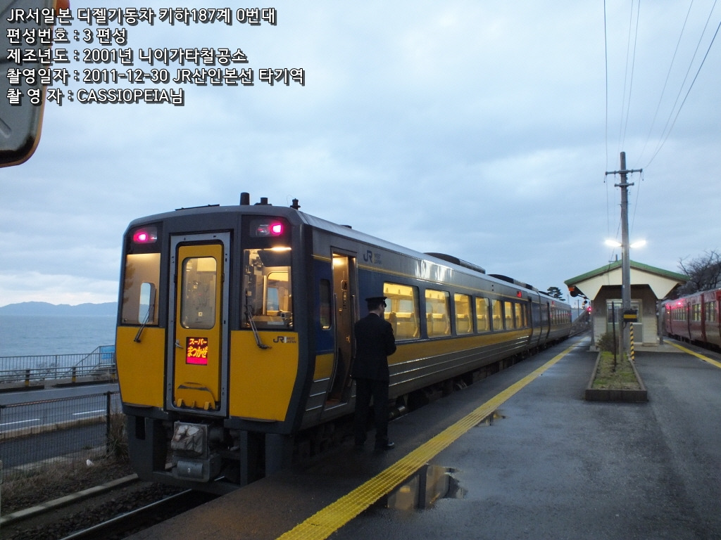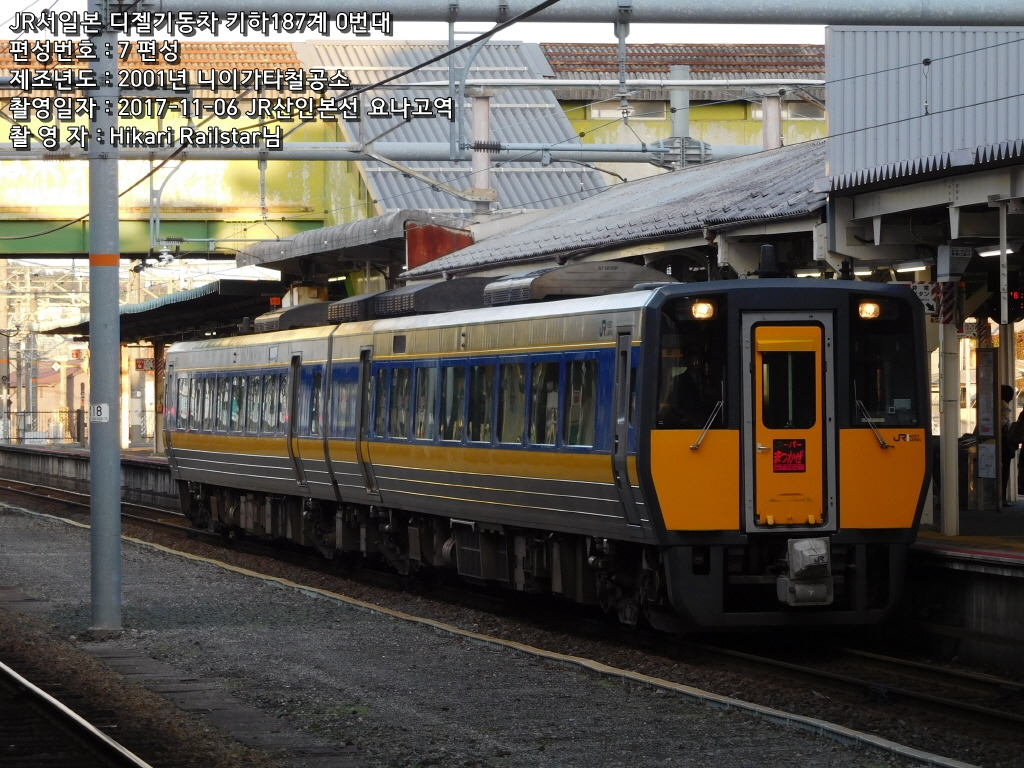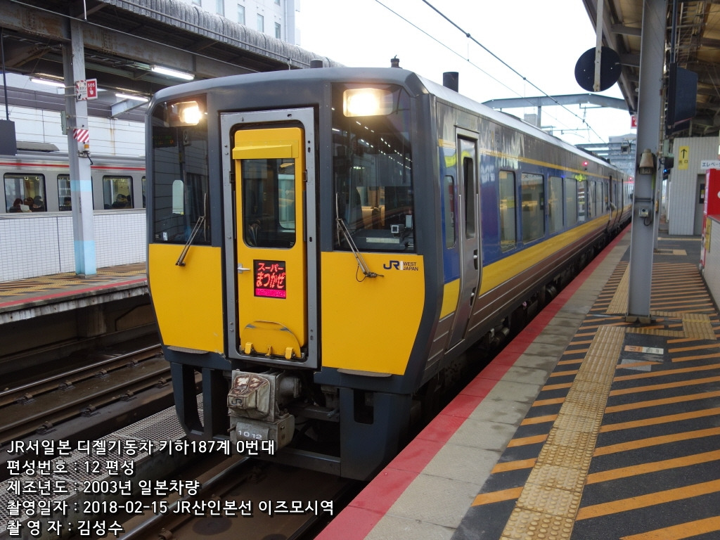 키하187계 특급형 기동차는 JR서일본의 산인본선 등지를 운행하는 특급열차로 운용되며, 2량 고정편성으로 운행한다. 산인본선 고속화공사에 따라 고속 틸팅열차로 운행함과 동시에, 노후화된 키하181계를 대체하기 위해 도입하였다. JR서일본이 최초로 신제투입한 특급형 디젤기동차이기도 하다. 381계 등에 탑재된 자연틸팅 방식을 채용한 차량이다.