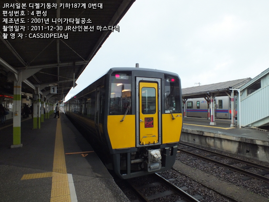 최고운전속도 120km/h로 산인본선 고속화에 크게 기여하였고, 키하187계 차량 투입 이후 특급열차의 소요시간이 많이 단축되었다. 현재는 신야마구치~돗토리 구간의 특급 슈퍼 마츠카제/슈퍼 오키에 투입되고 있다.