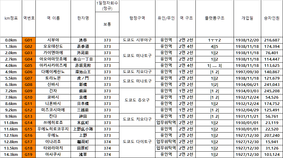 [간토지역]★ [19/19] 도쿄메트로 - 도쿄메트로 긴자선(銀座線/시부야~아사쿠사, 14.3km)