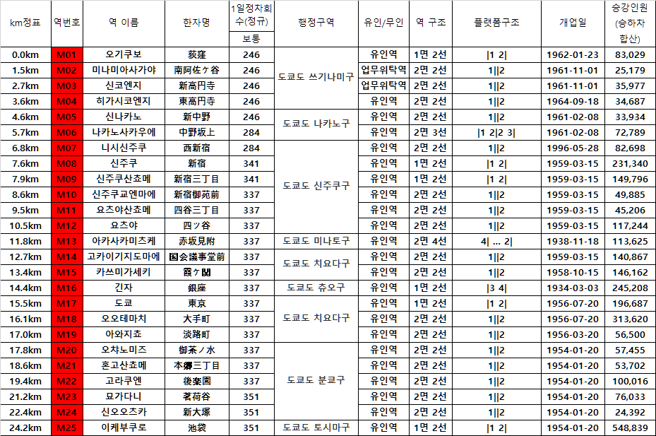 역수 : 25개 역(오기쿠보~이케부쿠로)