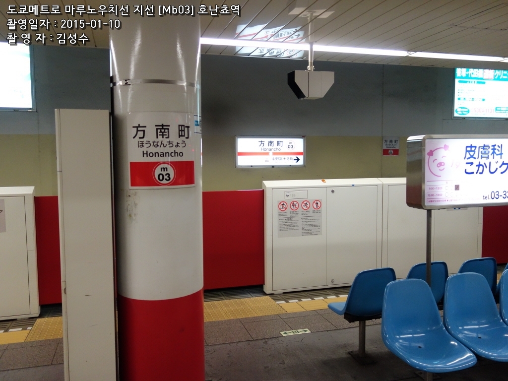 도쿄메트로 마루노우치 지선은 지하철 마루노우치선의 분기 지선 노선으로, 통칭 호난쵸지선으로 부른다. 호난쵸 지선 전용차량은 3량편성으로 운용되는데, 오승차를 방지하기 위해 검은색으로 띠가 둘러져 있으며 노선기호는 Mb를 사용한다. 예전에는 소문자 m을 사용했으나 발음이 같기 때문에 외국인들에게 혼동을 줄 우려가 있으므로 노선기호를 변경하였다.