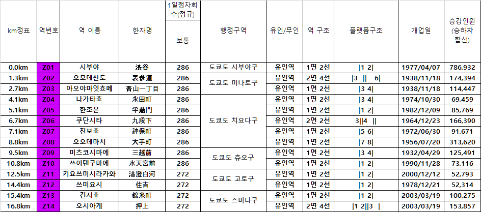 영업 km : 16.8km(시부야~오시아게) / 전 노선 지하구간