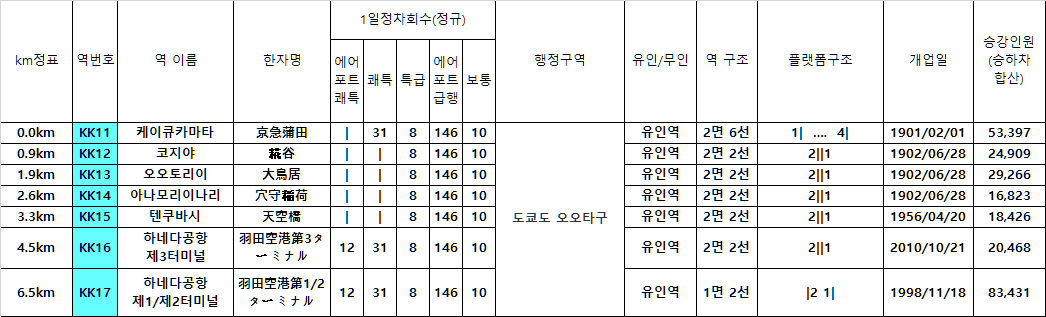 역수 : 7개 역(케이큐카마타~하네다공항 1/2터미널)