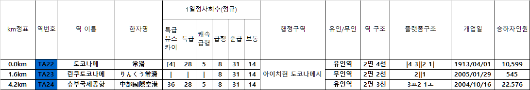 역수 : 3개 역(도코나메~츄부국제공항)