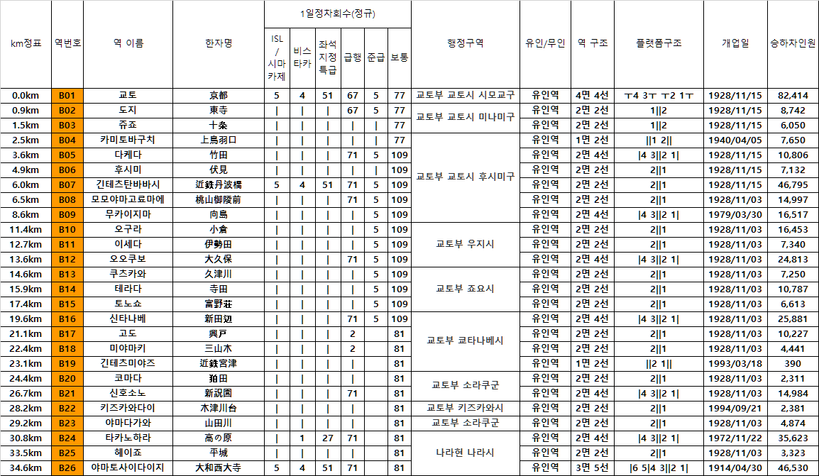 역수 : 26개 역(교토~야마토사이다이지)