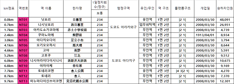 역수 : 13개 역(닛포리~미누마다이신쓰이코엔)