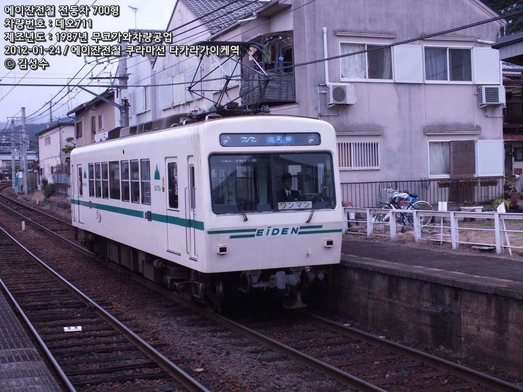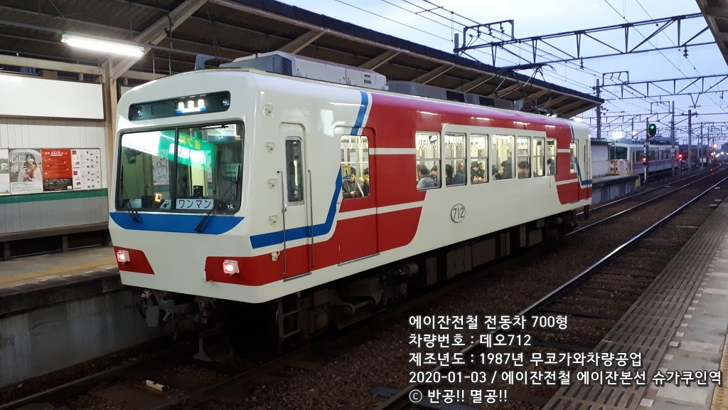 에이잔전철 700형은 1987년부터 제조된 차량인데, 경영합리화에 따른 1인승무운전, ATS도입, 냉방서비스 등의 제공을 위해 기존 차량의 기기를 유용해서 한신전철의 자회사인 무코가와차량공업으로부터 8량이 제조되었다. 1량편성에 양운전대형 제어차량으로 되어 있으며 크게 데오710형, 데오720형, 데오730형으로 나뉜다.