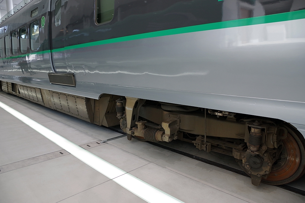 대차도 기존선-고속선에서 운행 기준을 맞추기 위해 여러가지 대차가 시험되었으며 기존의 IS식을 개량해 민덴식 대차의 특성을 이어받으면서도 대차 크기를 줄이고 고속성능-곡선안정성 균형을 맞춘 지지판식 대차가 처음으로 채용되어 현재까지 모든 JR동일본 계열의 신간선 차량에 채용되고 있으며 차축도 중심부를 비운 중공축 방식으로 되어 경량화와 유지보수 성능을 확보했다. 특히 기존선 운행시 곡선 안정성을 맞추기 위해 대차 축간거리를 기존 2.5미터(기존선 차량은 2.1미터가 보통)에서 2.25미터 정도로 줄였다. 하지만 대차 축간거리가 좁아졌기 때문에 고속성능을 내기 어려워 최고속도는 240km/h에 억제되어 있으며 기존선에 들어갈때엔 130km/h에 맞춰져 있다.(그래도 시험운행 시절 345km/h까지 냈다고 한다)