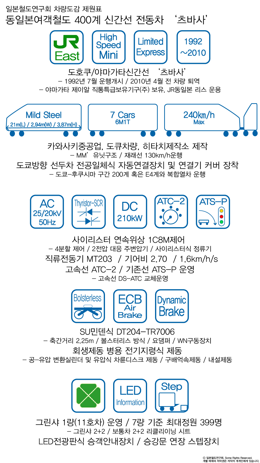 차체는 길이 21미터, 폭 2.9미터의 기존선 일반 전동차 사이즈에 맞춰졌다. 차체가 작기 때문에 강성확보를 위해 강철 세미모노콕크 차체가 적용되었으며 하부에는 전장품 커버가 갖춰졌으며 추운 지역을 운행하는 특성에 맞춰 상당한 수준의 내한내설 설계가 갖춰졌다. 200계와 같은 MM' 유닛구조를 채택하여 3개의 유닛으로 구성되어있으며 집전장치는 12,14호차에만 작은 하부교차프레임식 팬터그래프를 두고 지붕의 고압모선으로 일체화 하여 기존선에서는 한개, 고속선에서는 두개를 모두 사용하도록 했다. 주변압기는 1차권선의 수를 조절해 기존선의 2만볼트와 고속선의 2만 5천볼트 모두 지원하며 2차권선쪽은 4분할 형태의 사이리스터 위상연속제어 회로를 구성해 견인전동기를 제어한다. 견인전동기는 210kW급 직류직권전동기를 사용했다.
