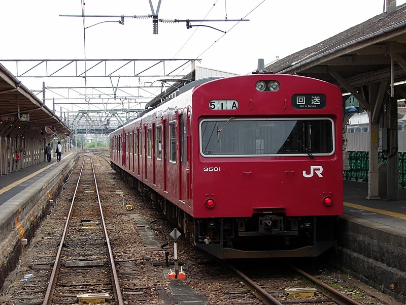 - 반탄선의 103계 3500번대. 마찬가지로 2량편성에 체질개선 N40과 지방형 1인승무 대응 개조가 되어있다. 반탄선은 히메지-데라마에 구간까지만 전철화 되어있어 보통열차는 이 103계와 아침 러시타임에 가끔 221계가 운용되고 있다.