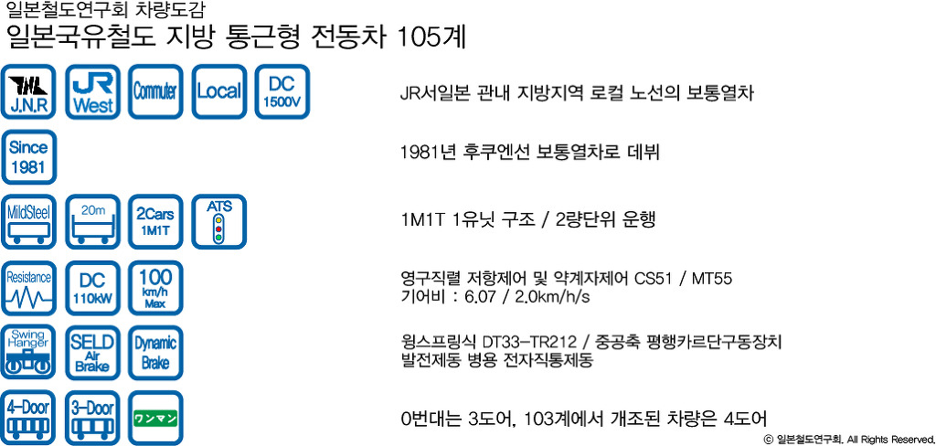 105계는 당시의 다른 전동차들과는 달리 지방의 한적한 노선에서 2량으로 운행하면서도 전력 소모를 최소화 할 수 있는 차량으로 제작되었다. 당시의 전동차 기본구조는 동력차 두량에 전장품을 나누어 싣고 항상 붙여 다니는 M'M구조를 택하고 있었는데, 105계는 전장품을 한량의 동력차에 모두 몰아 싣고 다른 한쪽은 무동력차로 만들었다. 따라서 기본 2량 단위에 1M1T의 운용이 가능했다. 기본적 전장품들은 전부 103계에서 사용되고 있는 제품들을 사용하고 있지만 기본이 되는 제어장치에는 고속 성능을 중요시 하지 않았기 때문에 간결한 영구직렬 저항제어로 변경했다. 승객 순환이 그리 많지 않다는 점을 감안해 3도어 배열을 했지만 실내는 롱시트로 되어있어 415계의 스타일을 따르고 있다.