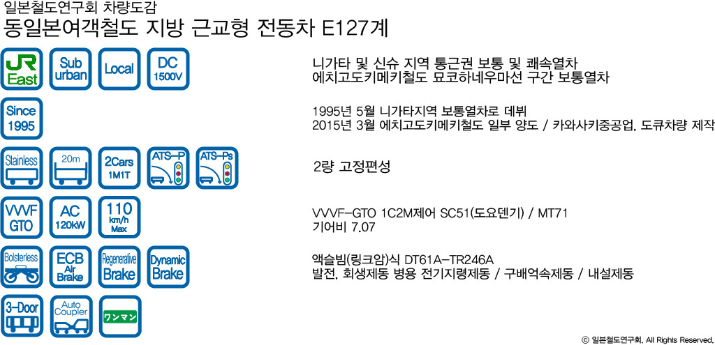 E127계는 1995년 5월에 니가타지구를 시작으로 도입되기 시작했다. 본래는 3월에 투입되기로 했으나 제작사인 카와사키중공업이 한신대지진을 맞아 다소 지연되어 도입되었다는 이야기가 있다. FRP로 둥글게 되어있는 전면부에 당시 운용되던 니가타지역의 115계와 색을 맞춘 녹색-연두색 띄를 둘렀으며 전체적인 차내 구성은 러시타임에 집중하기 위해 롱시트로 되어있으며 화장실도 갖춰져 있다. 롱시트라는 특성상 장거리 운용보다는 니가타 근교권에서만 운용되며 아침 시간대 나가오카 방면 열차로 집중 운용될 정도로 강력한 수송력을 최 강점으로 삼고 있다. 총 13개 편성 26량이 도입되었으며 이중 1개 편성이 2008년 건널목 사고로 인한 화재로 전소되어 총 12개 편성이 남아있었는데 이 중 2개 편성을 남긴 10개 편성이 2015년 3월 호쿠리쿠신간선 개통과 함께 신에츠본선 일부구간의 3섹터 전환으로 생긴 에치고도키메키 철도에게 양도되어 ET127계로 운용되고 있다. 남은 두개편성은 야히코선에서 집중 운용되고 있다.