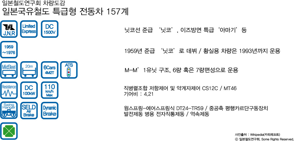 157계는 시작이 준급열차였지만 사실상 특급형으로 분류하고 있다. 운용 성격, 실내 수준 등은 특급형으로 운용되었기 때문이다. 기본적 성능은 먼저 등장한 급행형 전동차인 153계를 바탕으로 하고 있으며 1:1의 MT비가 아니라 2:1정도의 MT비로 운용되었다. 당시부터 특급형 도색과 동일한 크림+레드 도색을 하고 통유리창에 1등실은 리클라이닝 시트, 2등석은 전환식 크로스시트를 채용해 전형적인 특급열차의 성격을 띄고 있다. 국제적 관광지인 닛코를 연결하는 만큼 외국인을 위한 서양식 화장실 등 여러가지 편의시설을 갖추고 있었다. 다만 형식상으론 급행형이고 단거리 준급열차에 운용하려 했기 때문에 식당차가 없으며 대신 간단한 식사를 할 수 있는 매점을 갖추고 있었으며 에어컨을 갖추고 있지는 않았다(다만 냉방용 덕트는 갖추고 있었으며 1963년 냉방 개조되었다)