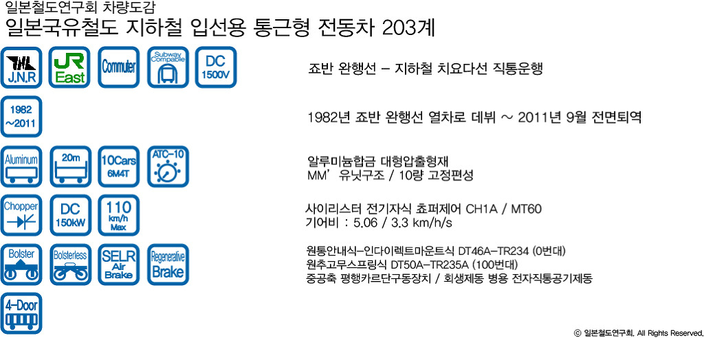 지하철 치요다선에는 도쿄메트로, JR(국철), 오다큐 전철 3개 회사가 직통운행을 하고있으며 이 중 JR의 203계와 도쿄메트로 6000계가 가장 큰 비중을 차지하고 있어 이 노선에서 가장 자주 볼 수 있는 차량이기도 했다. 1984년부터는 103계 1000번대를 완전히 밀어내기 위해 증비차를 투입, 205계와 동일한 볼스터리스 방식의 대차가 도입된 100번대도 투입되어 1986년 4월 죠반 완행선-지하철 치요다선의 국철 차량을 전부 203계로 통일시켜 운행했다.