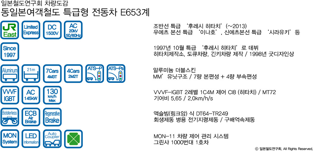JR동일본은 그간 철도차량의 표준적 사양과 디자인 사상을 제시하며 트렌드를 이끌어왔다. 이번에는 E653계로서 특급형 차량의 표준적 사양과 디자인을 제시하였다. 기존 JR동일본이 제작한 특급형 차량이 지역을 대표하는 "플래그쉽"의 역할이었다면 E653계는 그 "플래그쉽" 차량을 보조하는 주력차량으로서의 역할을 수행하고자 적절한 선에서의 표준화를 이룩했다. 차체는 알루미늄 더블스킨 구조로서 일본에서는 처음으로 이 구조를 채택했다. 히타치가 제안한 레일삽입 형식의 내장재 구조와 모듈형 설계로 제작, 정비, 개조시의 편의성을 모두 만족했다. 기본적으로 IGBT인버터를 사용한 VVVF제어 방식을 사용하고 있으며 전동기 또한 145kW급의 유도전동기를 채용해 충분한 출력여유를 두었다. 폭넓은 범용성을 고려해 50/60Hz에 모두 대응해 관내의 모든 전철구간을 운행이 가능하다. 한때는 호쿠에츠 급행선을 경유하는 "하쿠타카"의 JR동일본 투입분(485계 3000번대가 운행)에도 넣어볼까 했지만 JR동일본이 담당하는 구간이 길지 않았기 때문에 실현되지는 못했다(이후 호쿠에츠급행이 683게 8000번대를 투입하고 JR동일본이 빠져나갔다) 기본적으로 내한내설 능력을 갖췄기 때문에 조반선 뿐만 아니라 도호쿠 지역에서도 충분히 운행이 가능하며 대차는 기존 209계의 대차를 기반으로 승차감을 향상시킨 볼스터리스 대차를 사용하였으며 기존 MON-9의 성능을 향상시킨 MON-11 차량제어시스템을 갖춰 모니터링 뿐만 아니라 자체적인 제어능력까지 확보하였다. E653계에서 만들어진 표준적 차량 기술은 후일 히타치제작소에서 A-Train 범용설계안으로 발전되었으며 E257계, E751계등 JR 동일본 특급열차의 기준점이 되었다고 할 수 있다.