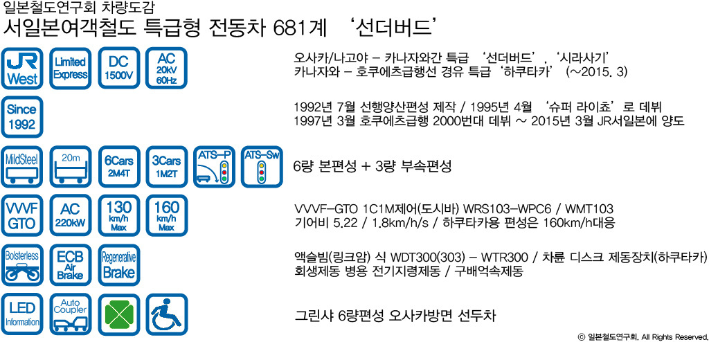 - 681계의 "선더버드" 엠블렘. 초기에는 "슈퍼 라이쵸"의 일부였기 때문에 "슈퍼 라이쵸"가 추가되어 있었다. 이것은 2002년 "슈퍼 라이쵸"가 "선더버드"에 흡수되면서 사라졌다.