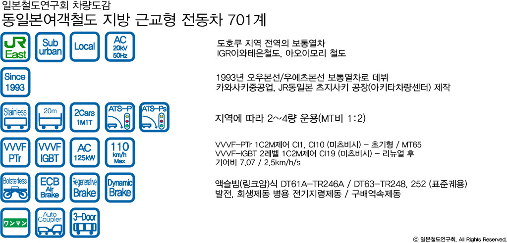 701계는 기본적으로 2량편성으로 운행되나 편성에 따라 3량편성도 있으며 수송밀도가 높은 센다이 지역의 경우에는 4량편성까지도 운행된다. 2량 편성 차량의 경우 원맨대응이 되어있으며 편성당 1개소의 화장실이 설치되어 있다. 출입문은 반자동 기능이 기본적으로 갖춰져 있으며 추운 지역을 운행하는 특성을 반영해 난방장치 만큼은 충실하게 갖췄다. 실내 구성은 단거리 이용객을 고려해 대부분의 차량이 롱시트로 되어있다. 도호쿠 본선은 센다이 지구를 제외한 모든 연선의 보통열차가 701계이므로(센다이도 701계 숫자가 꽤 많아 걸릴 확률이 높다) 쿠로이소부터 아오모리까지 보통열차로 올라간다면 계속 701계만 이용하게 되는것이 되며 장거리 여행자에겐 극악인 701계만 12시간 가까이 이용하게 되는 셈이 된다. 그래서 청춘18 티켓이나 홋카이도-도호쿠 패스와 같은 장거리 배낭여행자들 뿐만 아니라 1시간 이상의 장거리 승객의 불만이 꽤 높았다. 게다가 415계 전동차 등에 갖춘 출입문 옆 방풍유리나 출입문 에어커튼 같은게 없기 때문에 실내의 보온능력은 다소 떨어졌고 강력한 난방에 비해 라인플로우 팬도 갖추지 않는 등 냉방장치 능력은 떨어졌다. 이렇게 이용객들의 혹평을 받은 JR동일본은 단계적으로 개선정책을 펼쳐 세미크로스시트 개조, 냉방장치 개량, 화장실 면적 확대 등 여러가지 부분을 개선하기도 했다.
