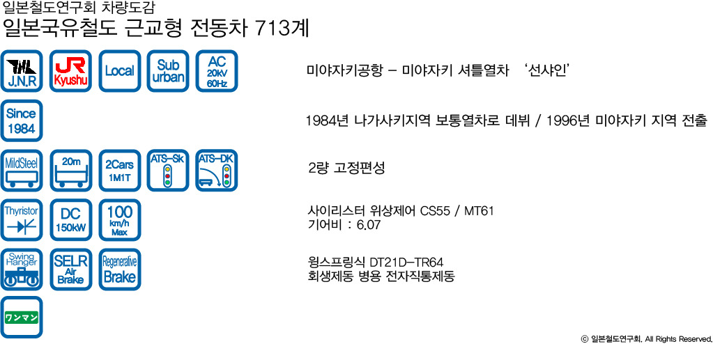 이렇게 잘 만들어진 713계지만 역시 417계처럼 4개편성 8량만 생산되고 급행형 전동차를 개조하거나 기기를 재생한 717계 등이 제작되어 아쉬움을 남겼다. 713계는 도입 후 나가사키와 사세보 지역에서 지속 운용되어 오다가 1996년 813계의 지속적인 투입과 미야자키 공항의 개항으로 미야자키공항선이 생기면서 미야자키로 이동해 미야자키공항역-미야자키 구간 셔틀열차로만 운용되었다. 그리고 동년 7월부터는 애칭인 "선샤인"도 붙이고 미토오카 에이지씨가 디자인한 빨간색 도색에 실내는 485계를 폐차하면서 나온 리클라이닝 시트를 붙이는 대규모 리뉴얼을 거쳐 장거리에서의 거주성이 크게 향상되었다. 이후 2008년 원맨 개조나 2014년 ATS-DK장착등의 이런저런 개조를 거쳐가며 현재도 미야자키공항 셔틀열차인 "선샤인"과 미야자키 지역 보통열차로 활약하고 있다.