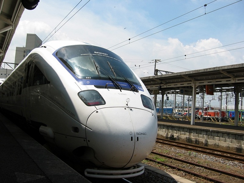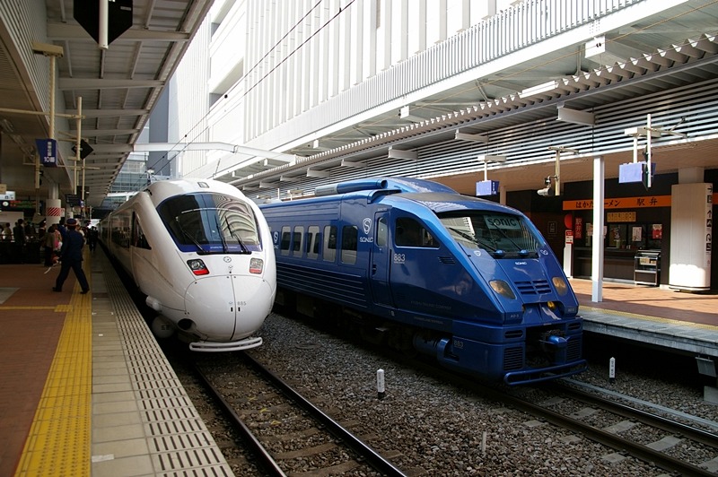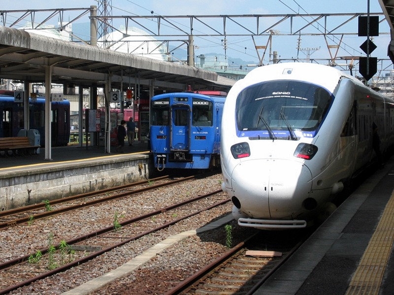 - 885계 "소닉"과 883계 "소닉"이 나란히 정차중인 모습. 어느걸 골라탈지 고민하게 만든다.