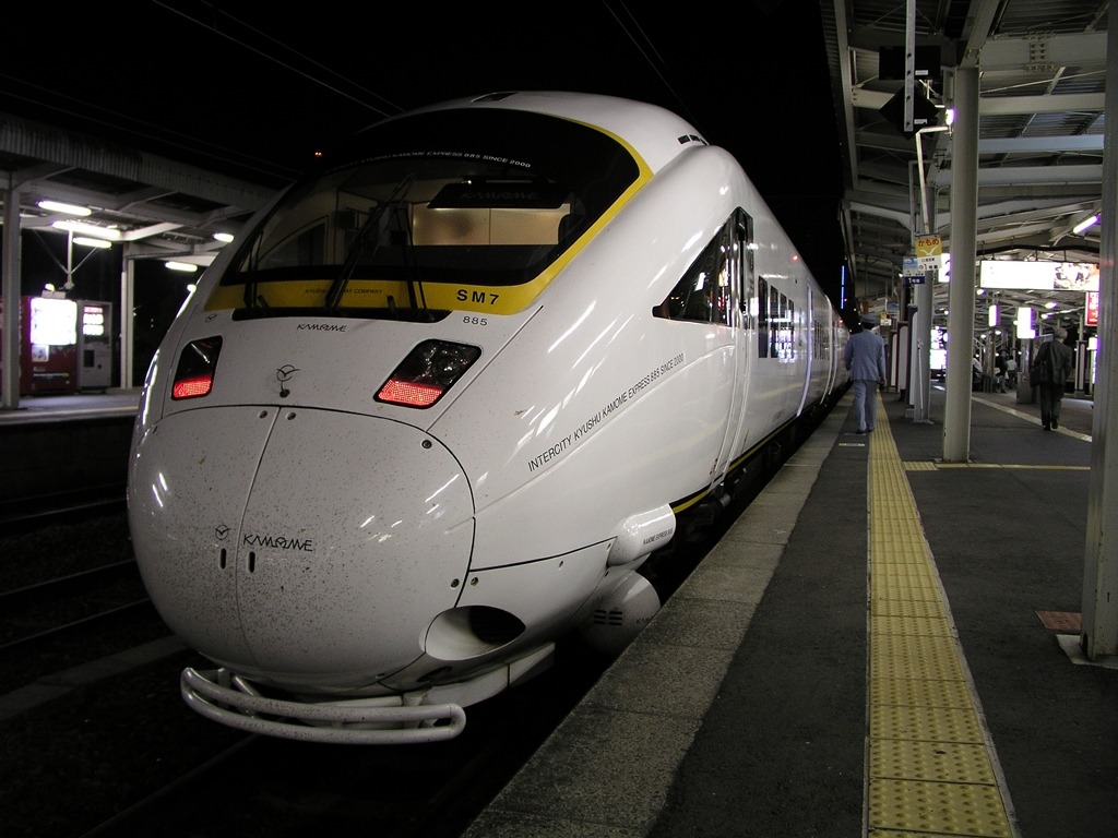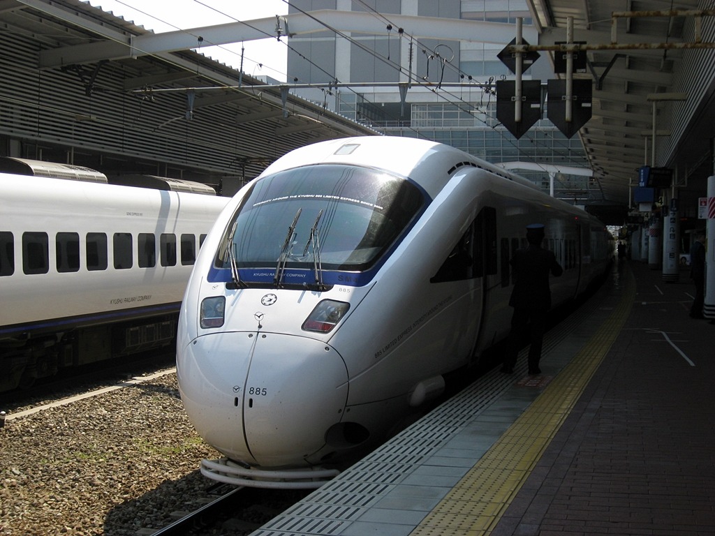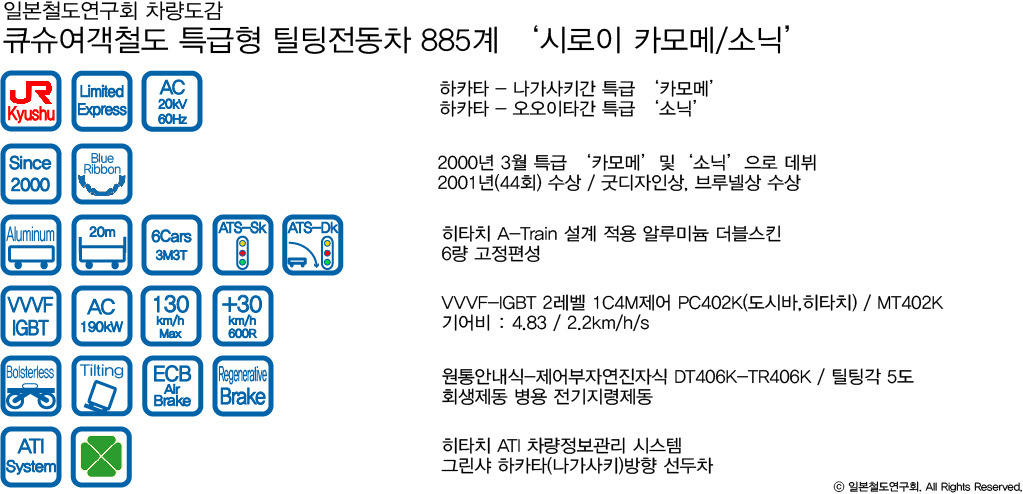885계는 처음 하카타-나가사키간의 "카모메"용으로 6량 7개편성, 2001년 하카타-오이타간의 "소닉"용으로 5량 4개편성이 제작되었는데, 이후 2003년에 "소닉"은 6량으로 증결되었고 차량의 특성상 카모메 편성이 특급 "(시로이) 소닉"에 유용되는 경우도 있다. 그리고 2003년 여름 나가사키 본선에서 있었던 885계 탈선전복사고(폭우로 인해 굴러떨어진 바위에 전복)로 인해 3량이 폐차되어 2004년에는 3량이 보충되었다. 이 탈선전복사고와 2005년 후쿠치야마선 탈선사고등으로 인해 차량의 무분별한 경량화에 대한 논란을 불러일으킨 장본인이 바로 885계이기도 하다. 그럼에도 885계는 중후한 이미지와 틸팅의 장점등을 살려 많은 관심을 받고 있다. 885계는 시각표에서 "시로이"편성 혹은 사세보 방면의 특급 미도리(하우스텐보스)와 병결되지 않는 열차로 표시되어 있기 때문에 쉽게 확인할 수 있다.