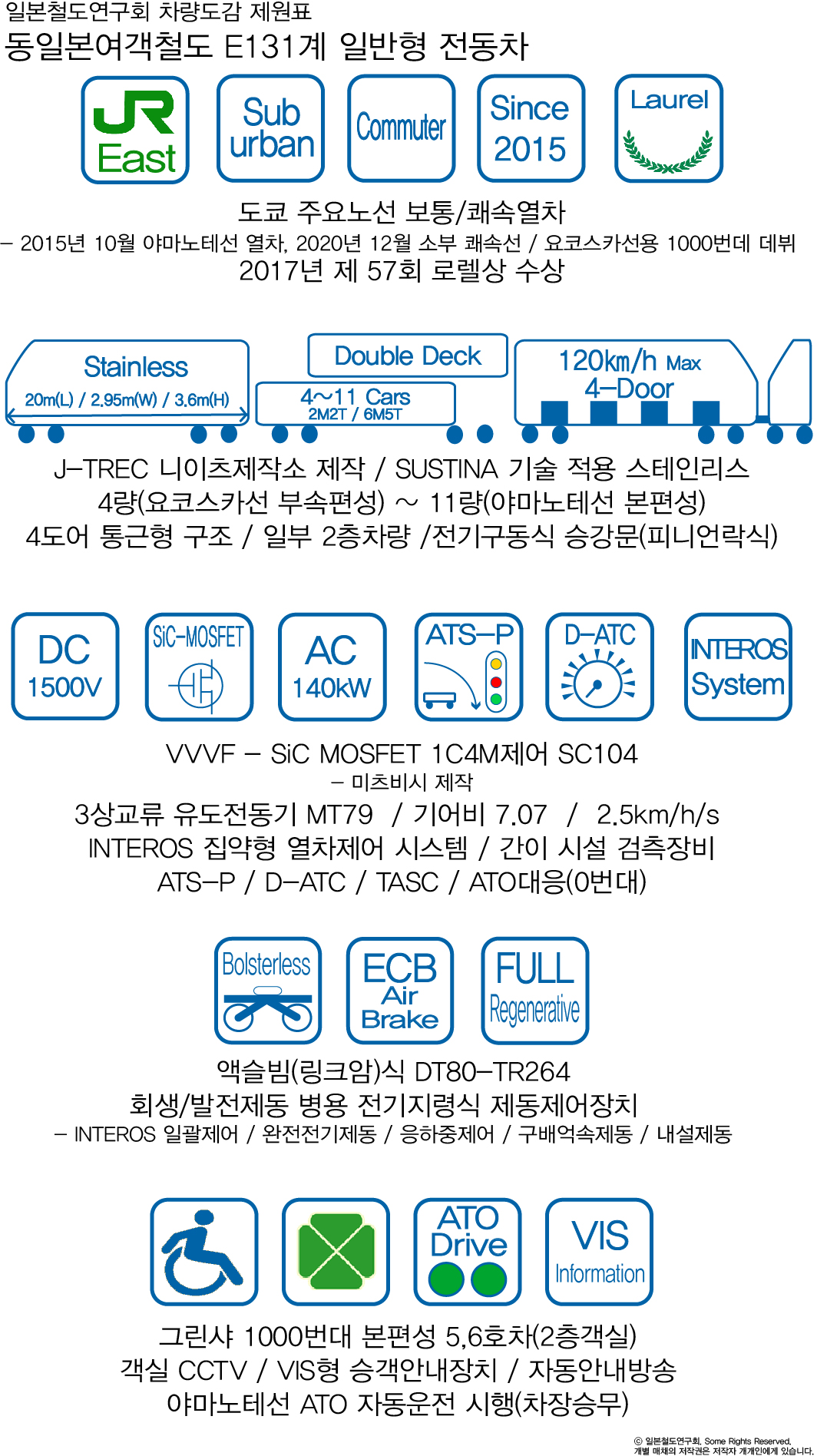 기존의 E217계와 사양을 맞추되 MT비를 늘린 11(6M5T)+4(2M2T)량으로 하였으며 단전 등 비상시 인접역까지 이동이 가능한 주회로 비상용 축전지가 채용되었으며 객실의 승객안내용 모니터도 기존 17인치에서 광고용 모니터와 동일한 21인치로 크게 늘렸다. 그린샤, 화장실 같은 편의설비는 E217계와 동일한 위치에 갖춰졌으며 특히 좌석과 내장이 고급화 되고 각 좌석마다 콘센트도 설치되어 있는 등 착석 통근의 편의성이 더욱 증대되었다.