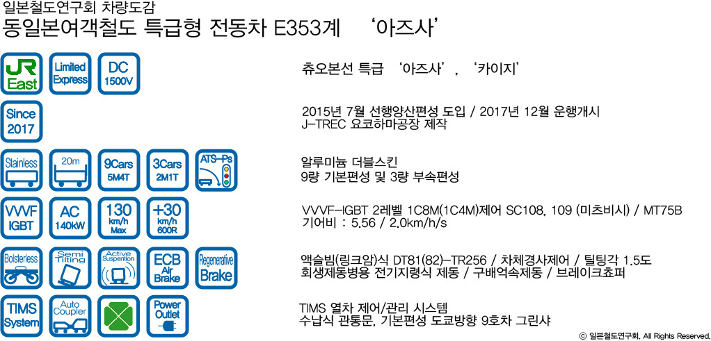 2010년대까지 츄오본선의 JR동일본 구간을 운행하는 특급열차 "아즈사"에는 틸팅열차인 E351계 "슈퍼 아즈사"와 E257계 전동차가 운용되고 있었다. 93년에 도입된 E351계 전동차가 도입 20년을 넘어 슬슬 노후화 되면서 2014년부터 신형 차량의 도입을 추진해 2015년 7월 신형 특급형 전동차인 E353계가 제작되어 2년 반이 넘는 시운전을 거쳐 2017년 12월부터 운행에 투입되었다.