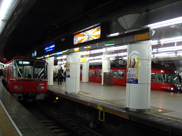 - 메이테츠의 중심역 메이테츠 나고야의 모습. 중간역이라 회차가 사실상 불가능하며 역구내 혼잡으로 인해 종별, 행선지별로 승차위치를 매번 바꾸는 특이한 역이다.