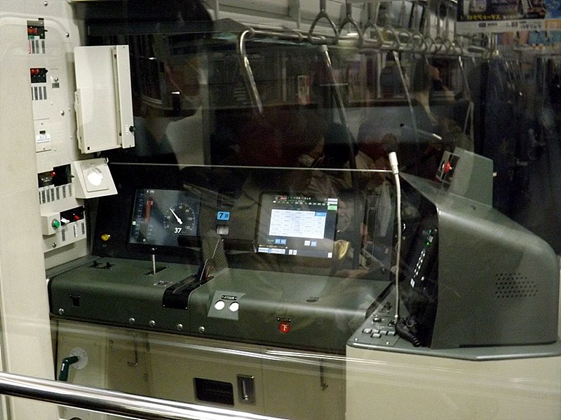 - 13000계 전동차의 제어대. 마스콘 옆의 두개의 흰색 버튼이 바로 ATO 출발버튼인데 1인승무는 염두하지 않은것인지 제어대 출입문 스위치는 따로 갖춰져있지 않다.