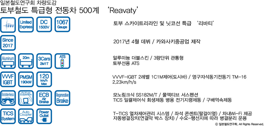 토부철도는 도쿄의 아사쿠사, 스카이트리와 토치기현의 관광지 닛코와 키누가와를 연결하며 평일에는 출퇴근용 착석통근으로 활약하는 여러가지 우등열차망이 갖춰져 있었고 이에따라 꽤 많은 숫자의 특급열차가 운행되고 있다. 90년 100계 "스페이시아"의 도입과 91년 폐차부품을 재생한 200계 특급형 전동차 이후로 20년 넘게 신형 특급열차의 소식이 없었는데 2017년 다소 침체된 닛코 지역과 연선 주변의 관광 자원 개발등을 목표로 JR 홋카이도에서 SL을 빌려오기도 했으며 스크린도어 설치 등 여러가지 안전설비 개량등의 투자를 통해 대대적인 서비스 개선 사업을 추진하게 되었다. 그 일환으로 기존 중장거리 쾌속/준급 열차로 운용되던 300계나 6050계 전동차를 특급열차로 대체할 겸 특급열차 서비스의 유연성을 높히기 위해 신형 500계 전동차 "리바티"를 도입하게 되었다. 애칭인 "리바티"(Revaty)는 병결 분리에 의한 다양한 목적의 특급열차 - 버라이어티함- 의 Variety와 선로를 종횡무진 누비는 자유도 높은 차량을 뜻하는 Liberty를 합친 조어로 2017년 4월부터 운행을 시작했다.