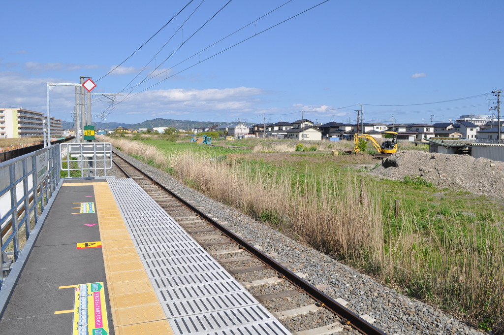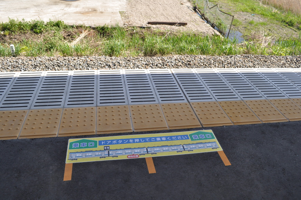사진에서 보듯이 단선 즉, 1면 1선 구조에 좌측 (태평양쪽)으로는 농지와 전원 지대가 있고, 우측으로는 인구 거주지가 있는 형태이며, 또한 역사 전체가 외부로 노출되어 있는 성격입니다. 우측으로 이 역의 역명판이 낮게 설치되어 있습니다]