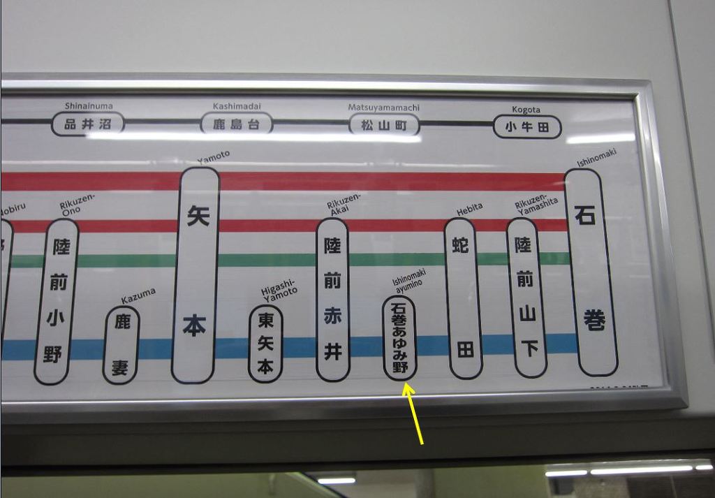 [센세키선을 운행하는 열차 내에서 새롭게 바뀐 노선도를 확인할 수 있습니다. 이시노마키역에 가까이 존재하는 지역에 리쿠젠 아카이역과 헤비타역 사이에서 신규 개업한 이시노마키 아유미노역 입니다. 센세키선 각역 정차 보통열차들이 정차하는 역 입니다]