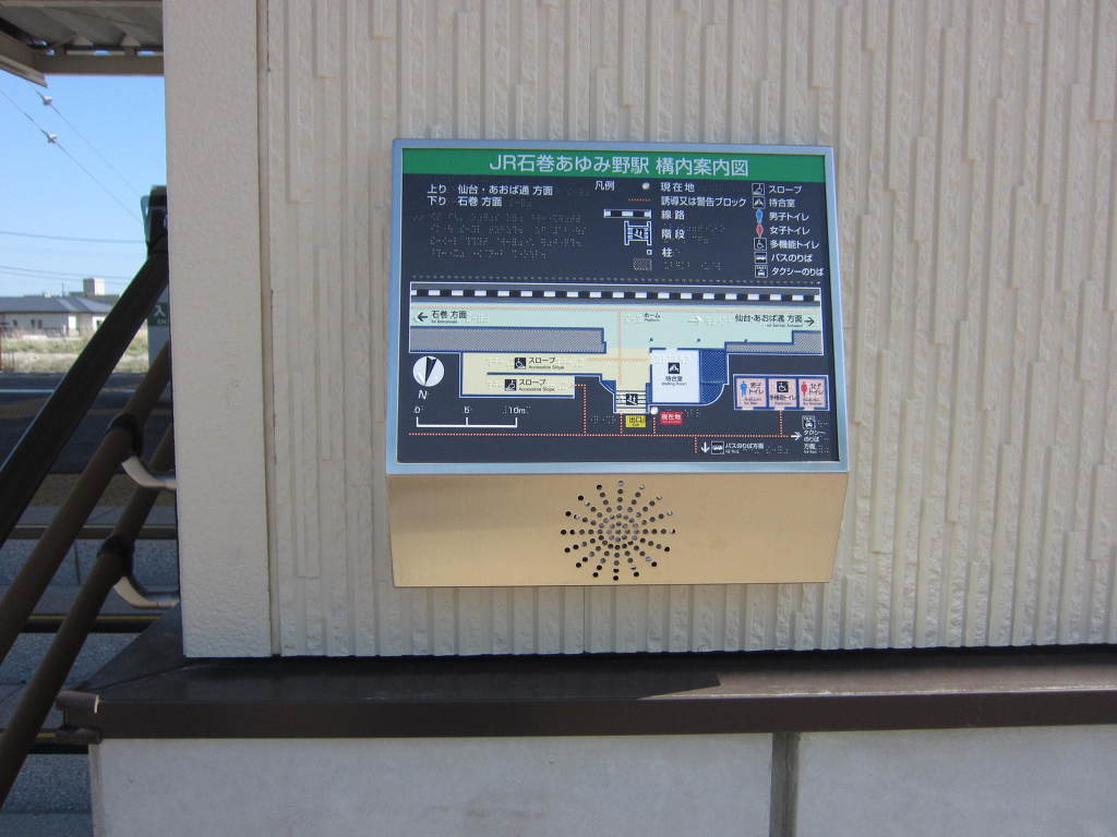 [역사 입구에는 역 구내도가 부착되어 있고, 점자 안내도 되어 있습니다. 아울러, 주변 관할 역과 연락할 수 있는 통신 체계도 갖추어져 있습니다.]