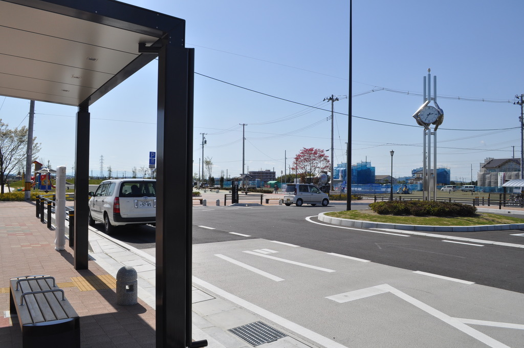 [이시노마키 방면으로 보면서 역 앞의 보도 블록의 모습입니다. 짙은 색도 아니고 시각적으로 평안함을 느낄 수 있는 색조입니다]